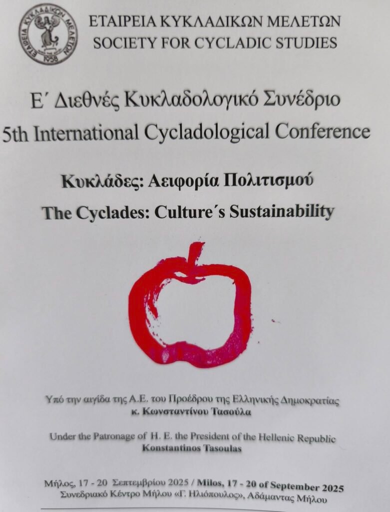 Με μεγάλη επιτυχία ολοκληρώθηκε το 5ο Διεθνές Κυκλαδολογικό Συνέδριο στη Μήλο, το οποίο πραγματοποιήθηκε από την Εταιρεία Κυκλαδικών Μελετών υπό την αιγίδα της Α.Ε. του Προέδρου της Ελληνικής Δημοκρατίας, κ. Κωνσταντίνου Τασούλα. Το συνέδριο, με θέμα «Κυκλάδες: Αειφορία Πολιτισμού», φιλοξένησε σημαντικούς μελετητές και ερευνητές, μεταξύ των οποίων ξεχώρισε η παρουσίαση της εργασίας της Ευαγγελίας Κοντού από τη Μύκονο.