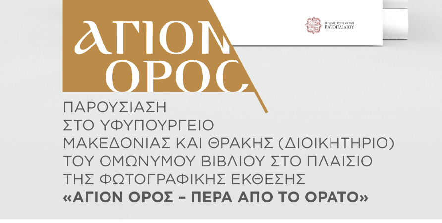 Η έκθεση φωτογραφίας του Γιάννη Γιαννάτου «Άγιον Όρος – Πέρα από το Ορατό», που παρουσιάστηκε την άνοιξη στο Ζάππειο και συγκέντρωσε το ενδιαφέρον του κοινού μεταφέρεται στη Θεσσαλονίκη, από τις 27 Σεπτεμβρίου στην αίθουσα εκθέσεων του Υφυπουργείου Μακεδονίας Θράκης σε συνδιοργάνωση της Ιεράς Μεγίστης Μονής Βατοπαιδίου και του Υφυπουργείου Μακεδονίας Θράκης με την υποστήριξη και χορηγία του Ιδρύματος Αιγέας. Τα εγκαίνια της έκθεσης θα πραγματοποιηθούν από την Α.Θ.Π., τον Οικουμενικό Πατριάρχη κ.κ. Βαρθολομαίο.