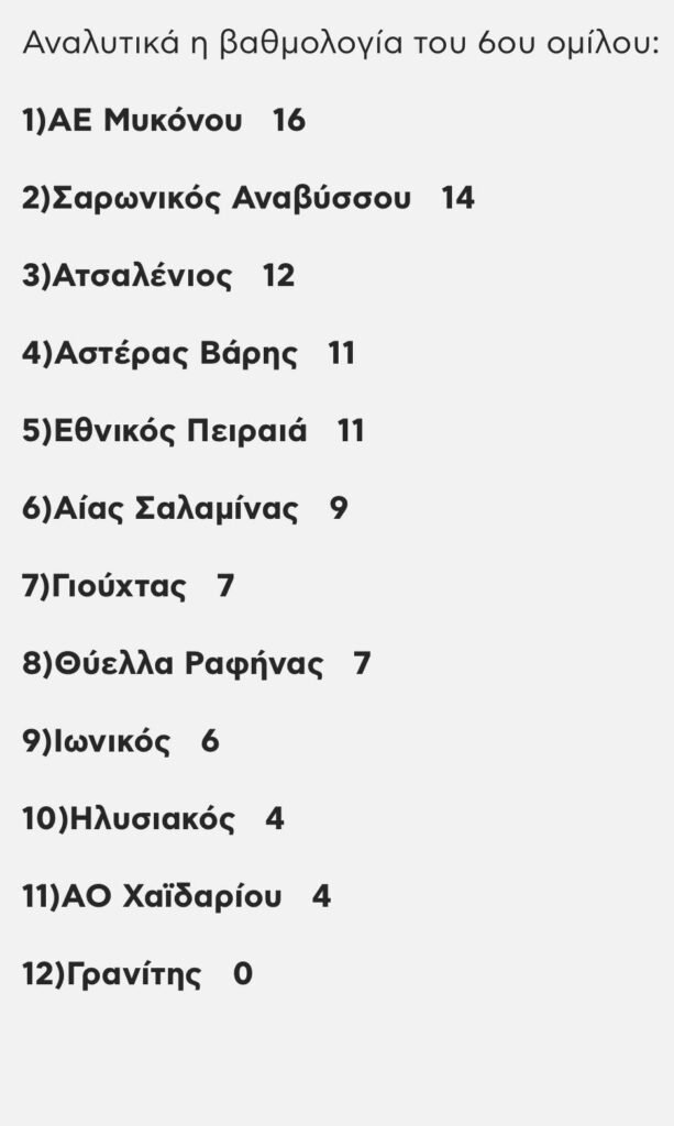 Σταθερά πρώτη και αήττητη παρέμεινε η ΑΕ Μυκόνου, μετά την πολύτιμη εκτός έδρας νίκη της με σκορ 2-1 επί του Αίαντα Σαλαμίνας, στην αναμέτρηση που άνοιξε την αυλαία της 6ης αγωνιστικής του 6ου ομίλου της Γ’ Εθνικής.
