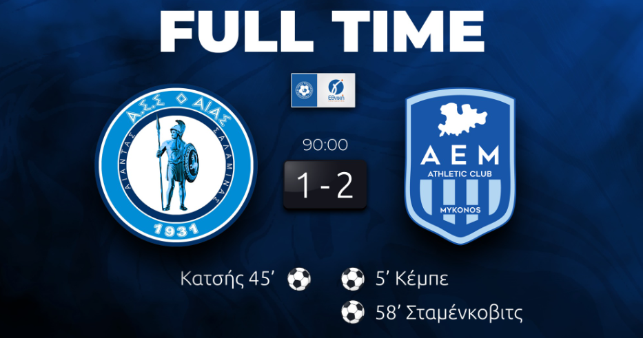 Η ομάδα των Κυκλάδων έδειξε τις διαθέσεις της από νωρίς, με τον Κέμπε να ανοίγει το σκορ μόλις στο 5ο λεπτό, δίνοντας προβάδισμα στους φιλοξενούμενους. Ο Αίας Σαλαμίνας, ωστόσο, δεν είχε πει την τελευταία του λέξη και κατάφερε να φέρει το παιχνίδι στα ίσα, λίγο πριν την ανάπαυλα. Συγκεκριμένα, ο Κατσής ισοφάρισε στην εκπνοή του ημιχρόνου, στέλνοντας τις δύο ομάδες στα αποδυτήρια με το σκορ στο 1-1.