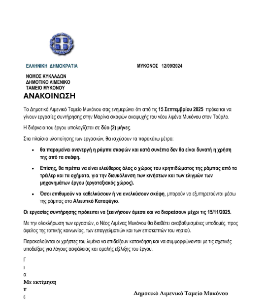 Εργασίες συντήρησης πρόκειται να πραγματοποιηθούν στη μαρίνα του νέου λιμένα Μυκόνου στον Τούρλο, με αποτέλεσμα την προσωρινή αναστολή της χρήσης της ράμπας σκαφών. Οι εργασίες, που ξεκινούν στις 15 Σεπτεμβρίου 2025, αναμένεται να διαρκέσουν για δύο μήνες, ολοκληρώνοντας το έργο γύρω στις 15 Νοεμβρίου 2025.