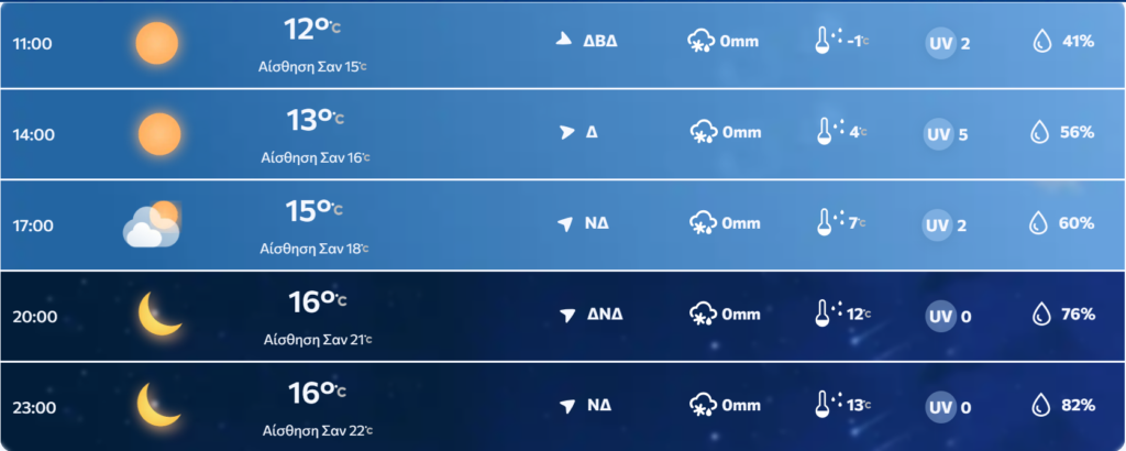 Ο υδράργυρος δεν αναμένεται να ξεπεράσει τους 14°C τις μεσημβρινές ώρες, ενώ η ελάχιστη θερμοκρασία θα αγγίξει τους 11°C. Λόγω των ισχυρών ανέμων, η «αισθητή θερμοκρασία» (wind chill) είναι αρκετά χαμηλότερη, απαιτώντας κατάλληλο χειμερινό ντύσιμο.