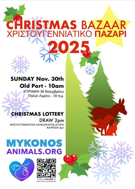 Σε εορταστικούς ρυθμούς κοινωνικής προσφοράς κινείται η Μύκονος, καθώς η Φιλοζωική του νησιού ανακοίνωσε τη διοργάνωση του καθιερωμένου, ετήσιου Χριστουγεννιάτικου Παζαριού της. Η εκδήλωση, που αποτελεί πλέον θεσμό για την τοπική κοινωνία, θα πραγματοποιηθεί την Κυριακή 30 Νοεμβρίου, στο Παλιό Λιμάνι.
