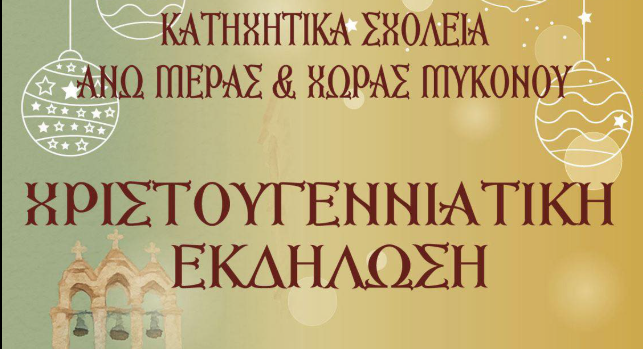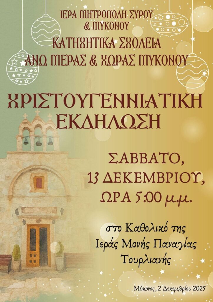 Η Ιερά Μητρόπολη Σύρου & Μυκόνου και τα Κατηχητικά Σχολεία Άνω Μεράς και Χώρας Μυκόνου προσκαλούν το κοινό σε μια ξεχωριστή Χριστουγεννιάτικη Εκδήλωση, που υπόσχεται να γεμίσει τις καρδιές μικρών και μεγάλων με το πνεύμα των ημερών.