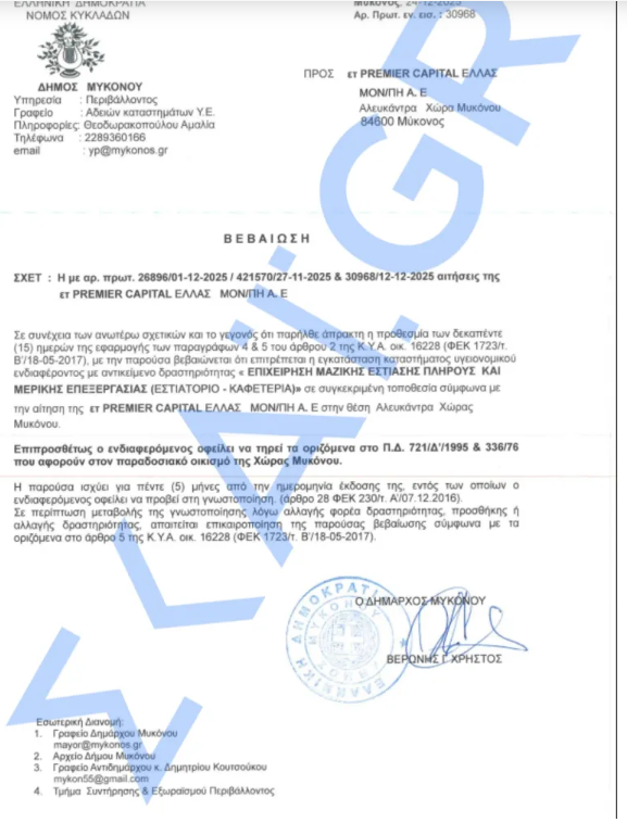 Στις 24 Δεκεμβρίου 2025, ο Δήμαρχος Μυκόνου, Χρήστος Βερώνης, υπέγραψε επίσημη βεβαίωση που επέτρεπε την εγκατάσταση επιχείρησης μαζικής εστίασης πλήρους και μερικής επεξεργασίας –δηλαδή εστιατορίου και καφετέριας. Η έγκριση αυτή, όπως αναφέρεται και στη σχετική βεβαίωση που παρουσιάζει το skai.gr, προέκυψε ουσιαστικά λόγω αδράνειας των υπηρεσιών του Δήμου: η προθεσμία των 15 ημερών που προβλέπει ο νόμος για την απάντηση σε αιτήσεις παρήλθε άπρακτη, με αποτέλεσμα η αίτηση της εταιρείας να θεωρηθεί αποδεκτή «διά της σιωπής», όπως προβλέπεται από τη νομοθεσία.
