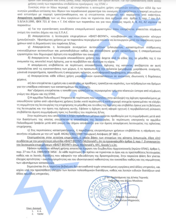 «Επισημαίνεται στην αιτούσα επιχείρηση, η οποία […] συνδέεται με την μεγαλύτερη αλυσίδα “ΦΑΣΤ ΦΟΥΝΤ” McDonald’s, ότι το προαναφερθέν άρθρο […] απαγορεύει την λειτουργία επιχειρήσεων “ΦΑΣΤ ΦΟΥΝΤ” όπως McDonald’s, KFC, Goody’s κ.λπ.»