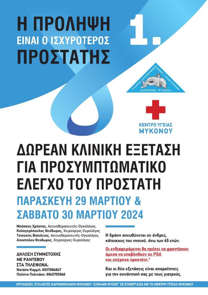 Με το σύνθημα «Η πρόληψη είναι ο ισχυρότερος προστάτης», οι φορείς υγείας του νησιού καλούν τους άνδρες της Μυκόνου να μην παραμελούν την υγεία τους και να αξιοποιήσουν αυτή τη δωρεάν παροχή που μπορεί να αποδειχθεί σωτήρια.