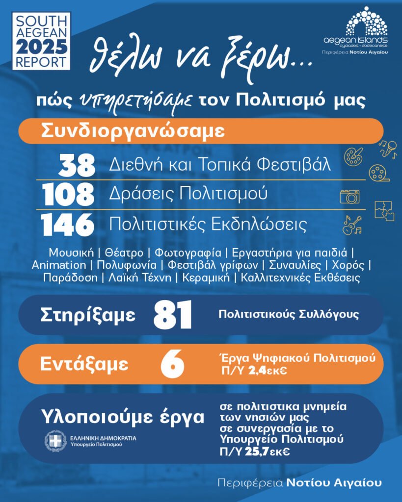 Συνεχίζεται ο απολογισμός του έργου της Περιφέρειας Νοτίου Αιγαίου, με τον Περιφερειάρχη Γιώργο Χατζημάρκο να θέτει σήμερα στο επίκεντρο τον Πολιτισμό, χαρακτηρίζοντάς τον ως τον κρισιμότερο κρίκο για τη διατήρηση της νησιωτικής ταυτότητας.
