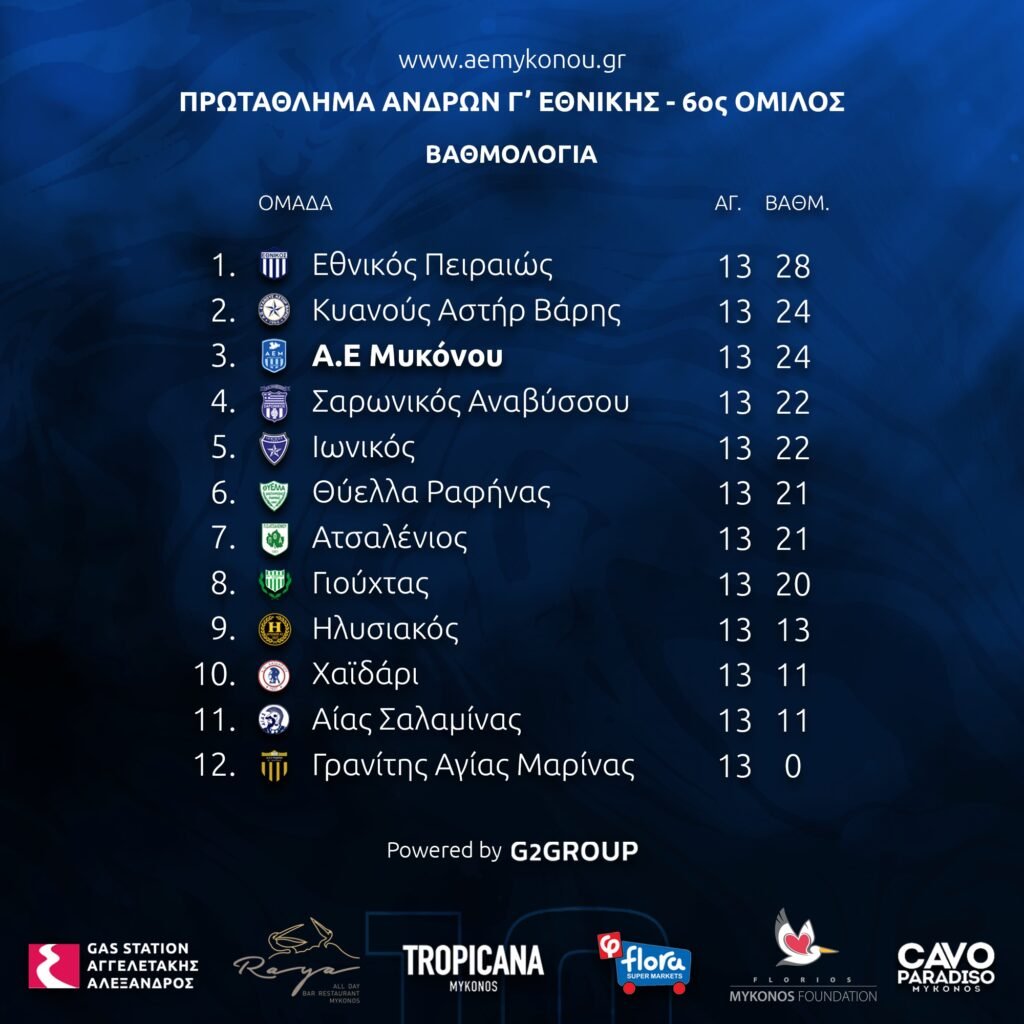 Με τον αέρα του πρωταγωνιστή συνεχίζει την πορεία της στο πρωτάθλημα της Γ’ Εθνικής η Α.Ε. Μυκόνου, η οποία φιγουράρει στις πρώτες θέσεις της βαθμολογίας του 6ου ομίλου. Η ολοκλήρωση της 12ης αγωνιστικής βρήκε την ομάδα σε πλεονεκτική θέση, παρά την οριακή ήττα στη Νίκαια από τον Ιωνικό (2-1), αποδεικνύοντας πως η φετινή ομάδα έχει μέταλλο και υψηλές βλέψεις.