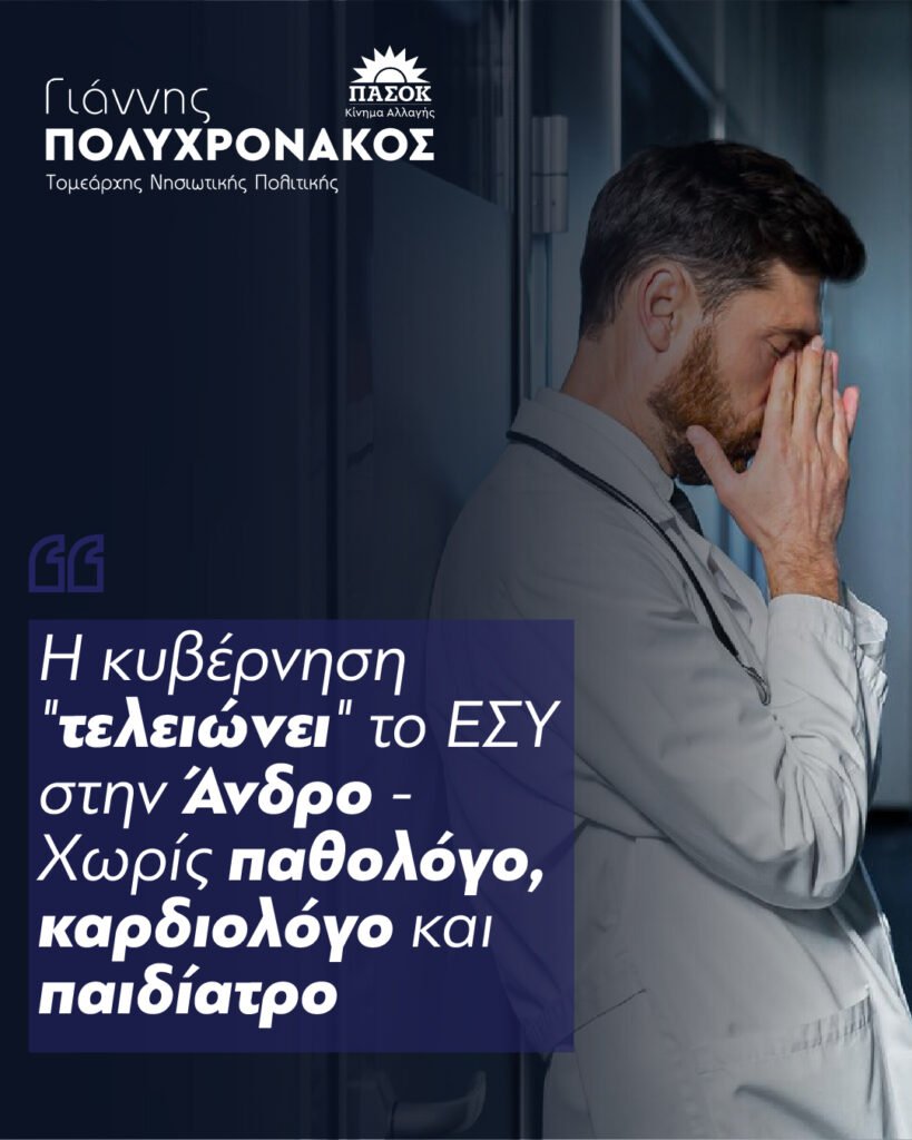 Στην οριακή κατάσταση λειτουργίας του Κέντρου Υγείας Άνδρου αναφέρεται με δημόσια παρέμβαση του ο Τομεάρχης Νησιωτικής Πολιτικής του ΠΑΣΟΚ κ.Γιάννης Πολυχρονάκος :