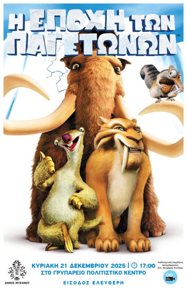Το εορταστικό κινηματογραφικό διήμερο ολοκληρώνεται την Κυριακή, στις 17:00, με την αγαπημένη σε όλους ταινία «Η Εποχή των Παγετώνων». Η ταινία αυτή, γνωστή για την περιπέτεια, το γέλιο και τους αξέχαστους χαρακτήρες της, θεωρείται ιδανική επιλογή για όλη την οικογένεια.