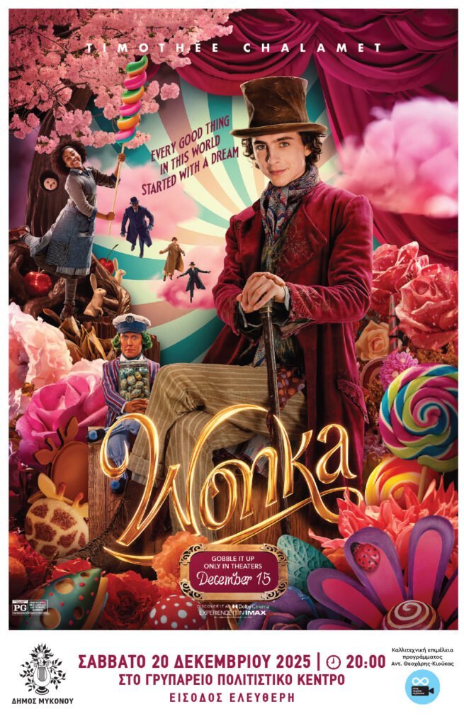 Το Σάββατο, στις 19:30, το κοινό θα έχει την ευκαιρία να παρακολουθήσει την οικογενειακή ταινία «Γούονκα». Σύμφωνα με την ανακοίνωση, πρόκειται για μια «τρυφερή, αστεία και συγκινητική ιστορία» που υπόσχεται να ταξιδέψει τους θεατές και να τους βάλει στο κλίμα των γιορτών.