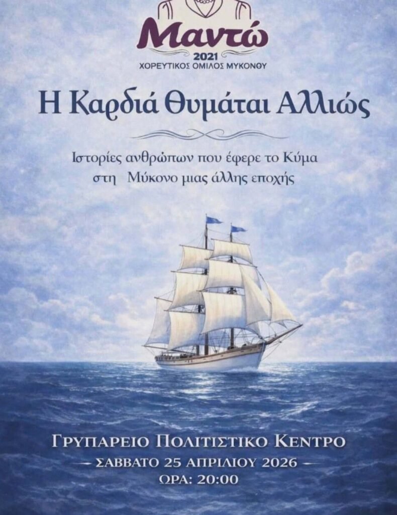 Σε ένα ταξίδι πίσω στον χρόνο, εκεί όπου η προσωπική ιστορία συναντά τη συλλογική μνήμη, μας προσκαλεί ο Χορευτικός Σύλλογος «Μαντώ» το προσεχές Σάββατο, 25 Απριλίου 2026. Με τίτλο «Η καρδιά θυμάται αλλιώς…», η επερχόμενη θεατρική και μουσικοχορευτική παράσταση υπόσχεται να φωτίσει τις αθέατες πλευρές της μυκονιάτικης ταυτότητας.