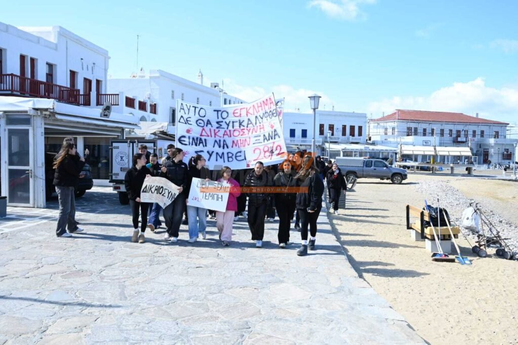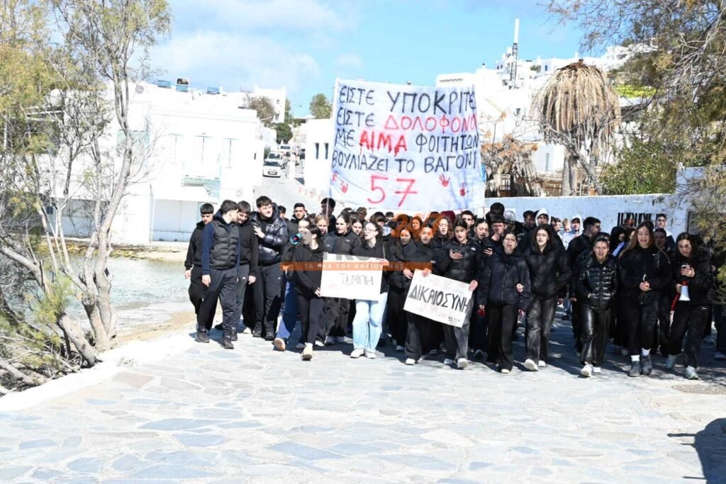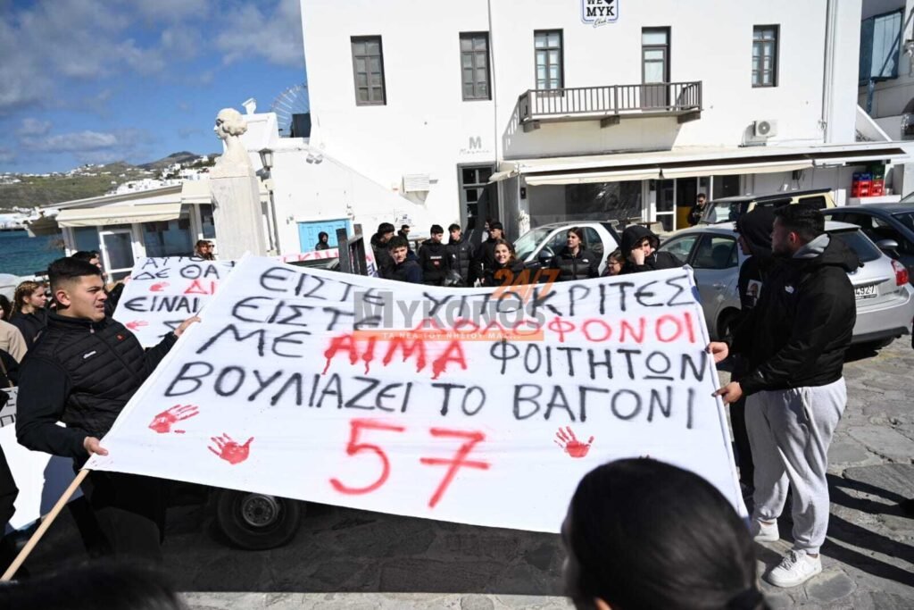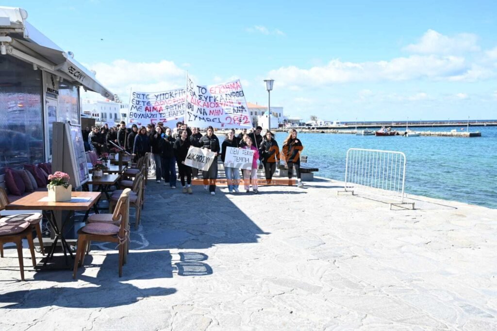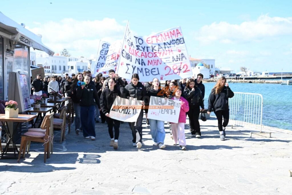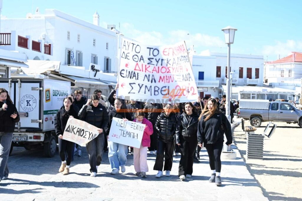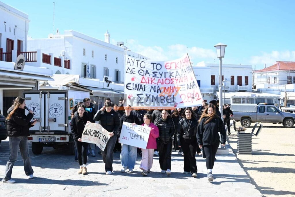 Με συνθήματα που ζητούν να μην ξεχαστεί το έγκλημα των Τεμπών, η νεολαία της Μυκόνου στέλνει ένα ηχηρό μήνυμα κατά της αδιαφορίας, διεκδικώντας ασφάλεια στις μεταφορές και διαφάνεια στην απόδοση ευθυνών.