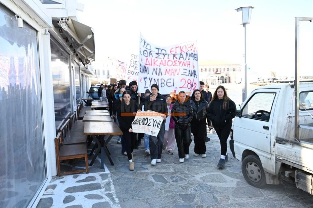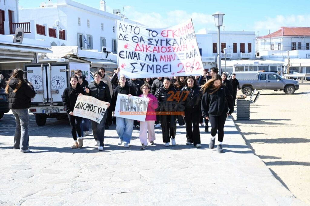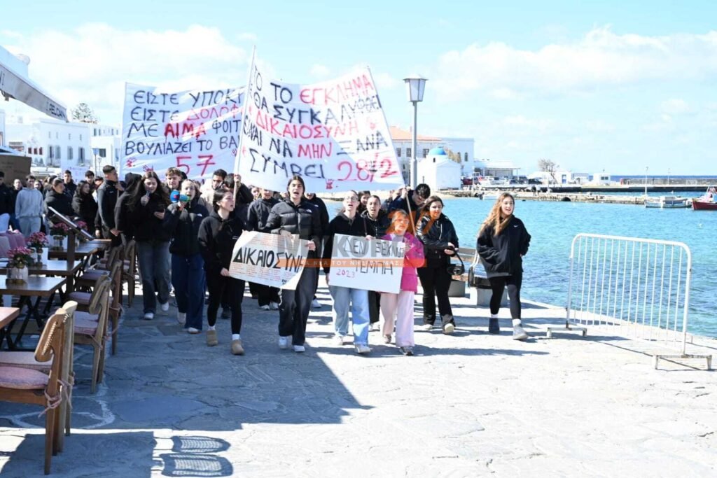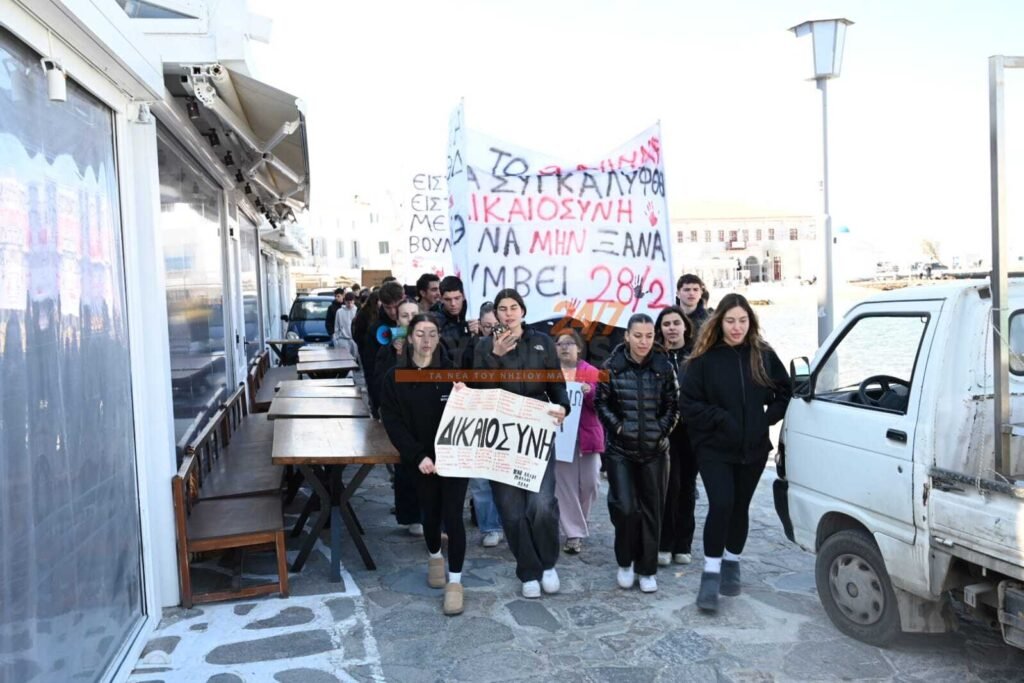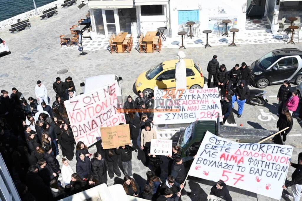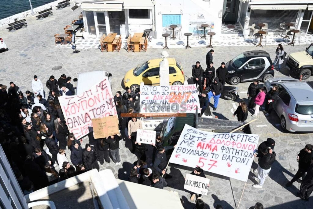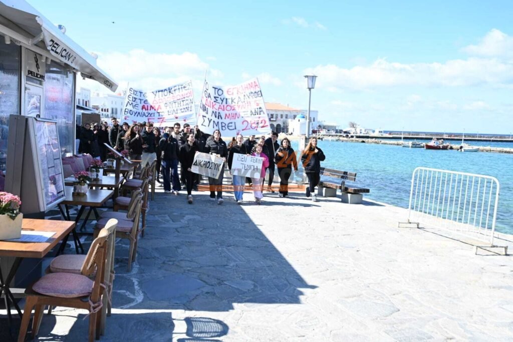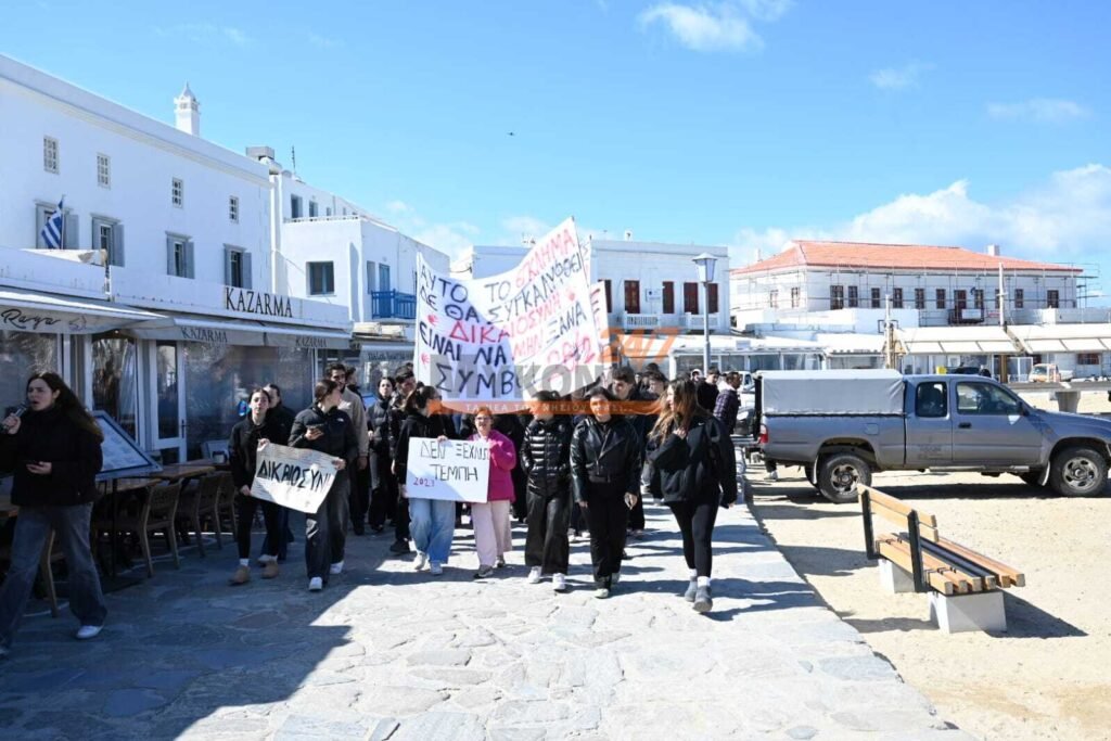 Με συνθήματα που ζητούν να μην ξεχαστεί το έγκλημα των Τεμπών, η νεολαία της Μυκόνου στέλνει ένα ηχηρό μήνυμα κατά της αδιαφορίας, διεκδικώντας ασφάλεια στις μεταφορές και διαφάνεια στην απόδοση ευθυνών.
