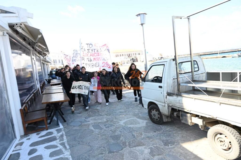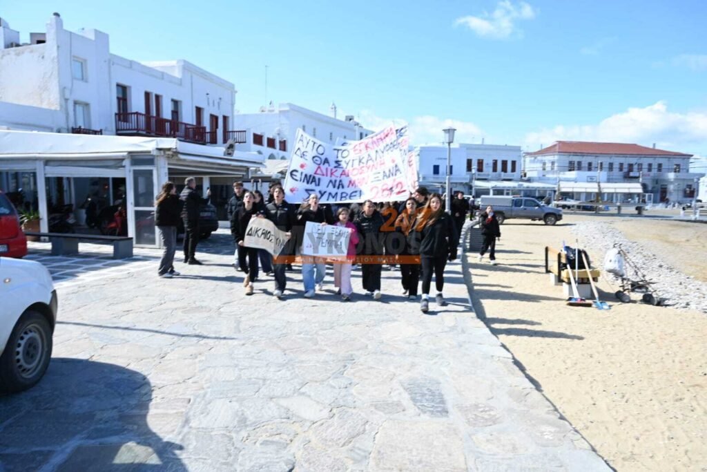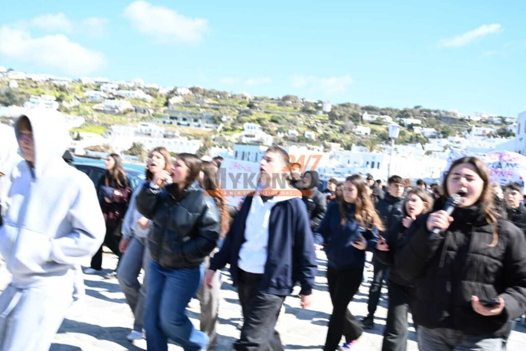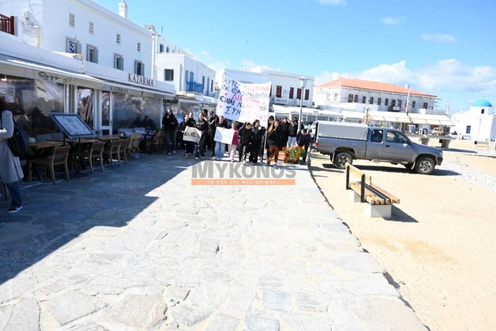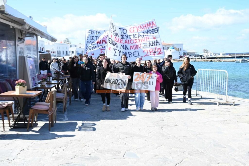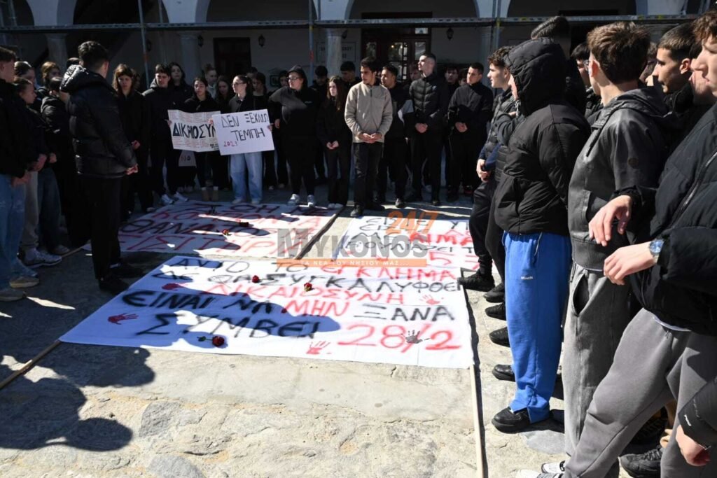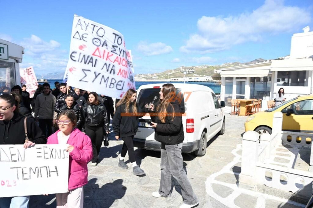 Με συνθήματα που ζητούν να μην ξεχαστεί το έγκλημα των Τεμπών, η νεολαία της Μυκόνου στέλνει ένα ηχηρό μήνυμα κατά της αδιαφορίας, διεκδικώντας ασφάλεια στις μεταφορές και διαφάνεια στην απόδοση ευθυνών.