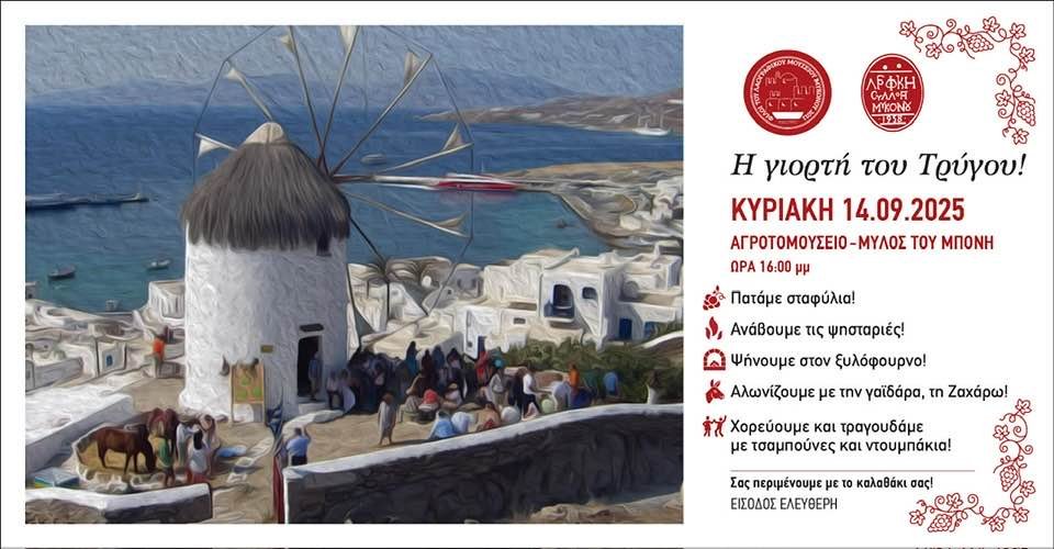 Η Μύκονος ετοιμάζεται να φορέσει τα γιορτινά της, τιμώντας μια από τις πιο παλιές και όμορφες παραδόσεις της: τον τρύγο. Την Κυριακή 14 Σεπτεμβρίου 2025, το Αγροτομουσείο – Μύλος του Μπόνη ανοίγει τις πύλες του για να υποδεχτεί κατοίκους και επισκέπτες σε μια μεγάλη γιορτή που θα ζωντανέψει τα έθιμα της αγροτικής ζωής.