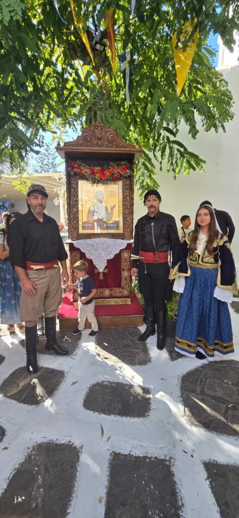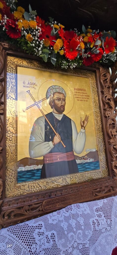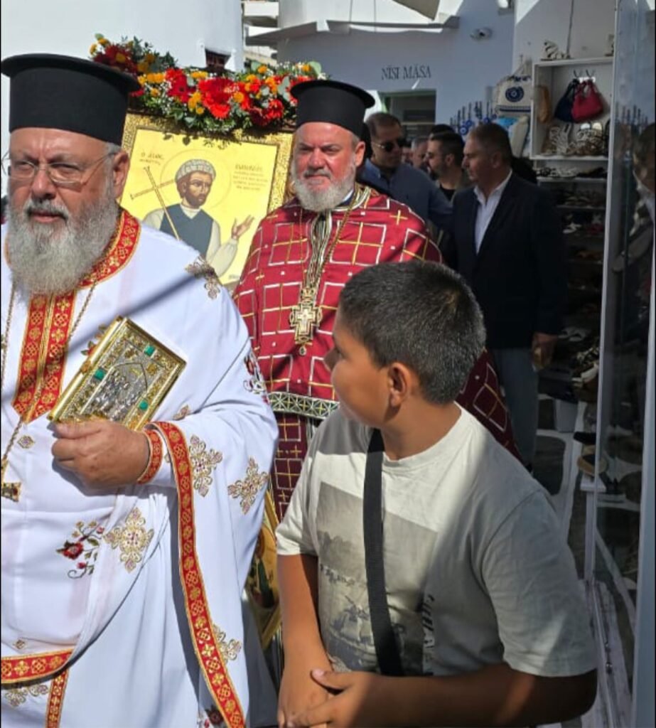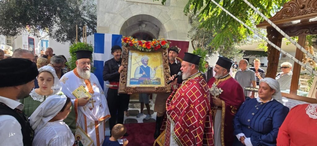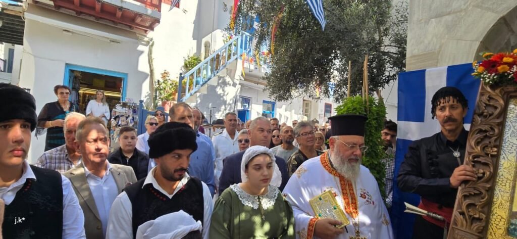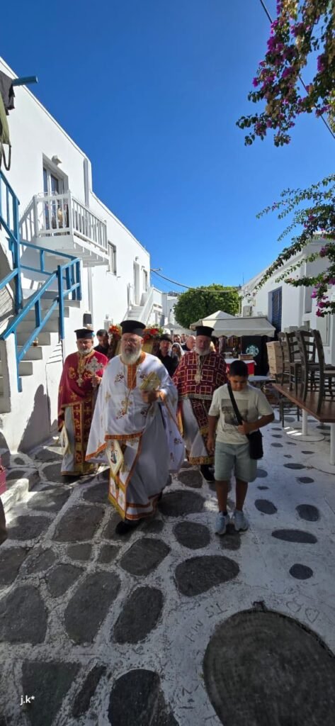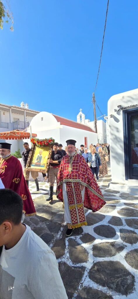 Ακολούθως, ο Σεβασμιώτατος κ. Δωρόθεος Β’ ετέθη επικεφαλής της λιτανείας της ιεράς εικόνος του Αγίου Νεομάρτυρος Μανουήλ, την οποία πλαισίωσαν Μέλη του Πολιτιστικού Συλλόγου “ΜΑΝΤΩ”, με παραδοσιακές ενδυμασίες και Κρήτες, οι οποίοι ζουν στη Μύκονο και κάθε χρόνο ιδιαιτέρως τιμούν το συντοπίτη τους Άγιο Μανουήλ.