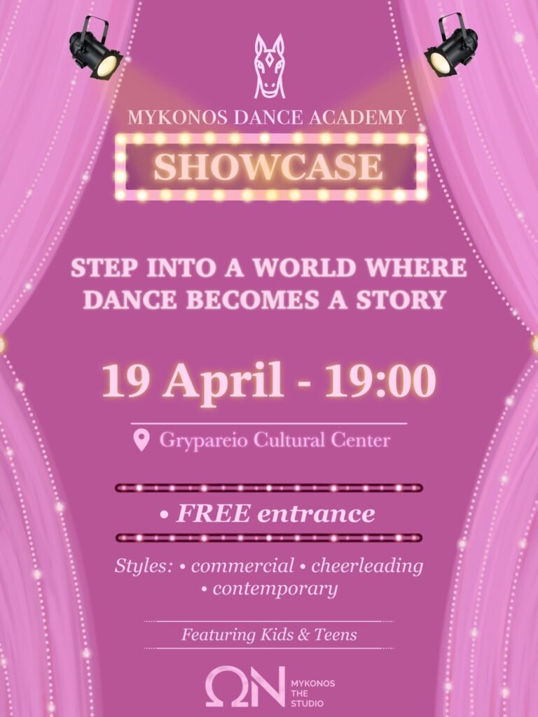 Μια βραδιά γεμάτη ρυθμό, πάθος και καλλιτεχνική έκφραση ετοιμάζεται να προσφέρει η Mykonos Dance Academy, η οποία προσκαλεί το κοινό στο ετήσιο showcase της. Η εκδήλωση θα πραγματοποιηθεί την Κυριακή 19 Απριλίου 2026 στις 19:00, στο Γρυπάρειο Πολιτιστικό Κέντρο.