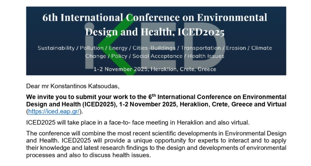 Το ICED2025 αναδεικνύεται ως κομβικό σημείο συνάντησης, καθώς, όπως τονίζεται, «θα συνδυάσει τις πιο πρόσφατες επιστημονικές εξελίξεις στον Περιβαλλοντικό Σχεδιασμό και την Υγεία». Ο στόχος είναι να δοθεί μια μοναδική ευκαιρία σε ειδικούς να ανταλλάξουν γνώσεις και να εφαρμόσουν τα ερευνητικά τους ευρήματα στους σχεδιασμούς και τις εξελίξεις των περιβαλλοντικών διαδικασιών.
