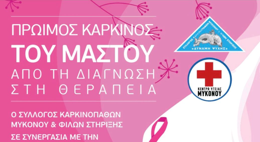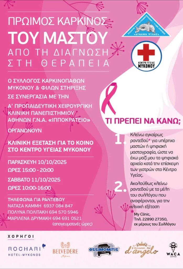Μια σημαντική πρωτοβουλία για την πρόληψη και την ενημέρωση σχετικά με τον καρκίνο του μαστού λαμβάνει χώρα στη Μύκονο, με στόχο την έγκαιρη διάγνωση και τη στήριξη των ασθενών. Ο Σύλλογος Καρκινοπαθών Μυκόνου & Φίλων Στήριξης, σε συνεργασία με την Α’ Προπαιδευτική Χειρουργική Κλινική του Πανεπιστημίου Αθηνών στο «Ιπποκράτειο», διοργανώνει κλινική εξέταση για το κοινό στο κέντρο υγείας με θέμα «Πρώιμος Καρκίνος του Μαστού: Από τη Διάγνωση στη Θεραπεία».
