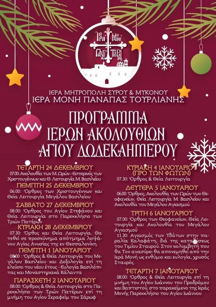 Με κάθε εκκλησιαστική λαμπρότητα και κατάνυξη ετοιμάζεται να υποδεχθεί τις μεγάλες εορτές του Δωδεκαημέρου η Ιερά Μονή Παναγίας Τουρλιανής, υπό την αιγίδα της Ιεράς Μητροπόλεως Σύρου & Μυκόνου. Το πρόγραμμα των Ιερών Ακολουθιών, που ξεκινά από την παραμονή των Χριστουγέννων και κορυφώνεται με τον εορτασμό των Θεοφανείων και του Αγίου Ιωάννου του Προδρόμου, ανακοινώθηκε επίσημα, προσκαλώντας τους πιστούς να συμμετάσχουν στις λατρευτικές εκδηλώσεις.