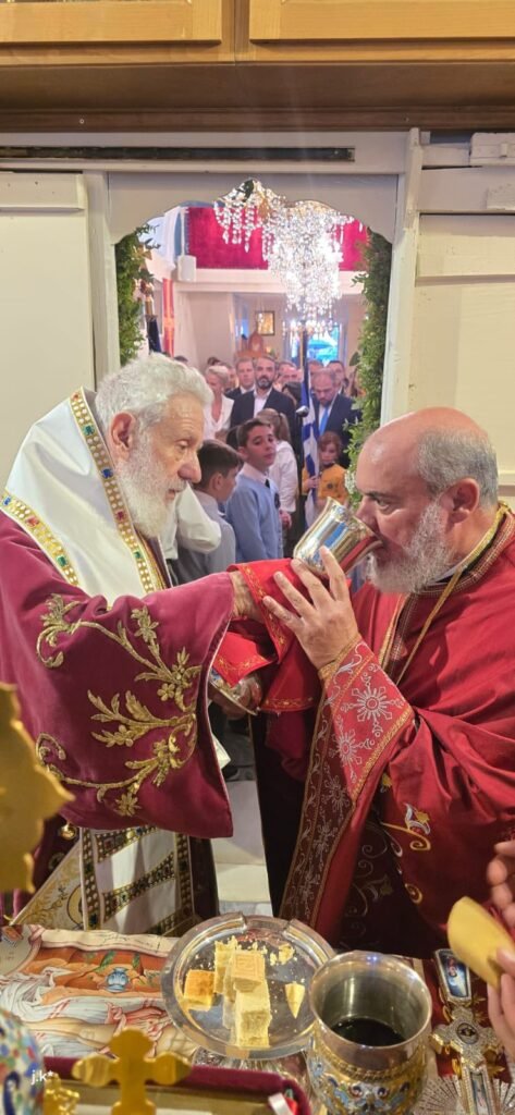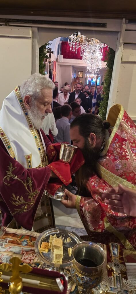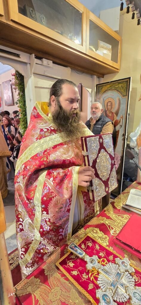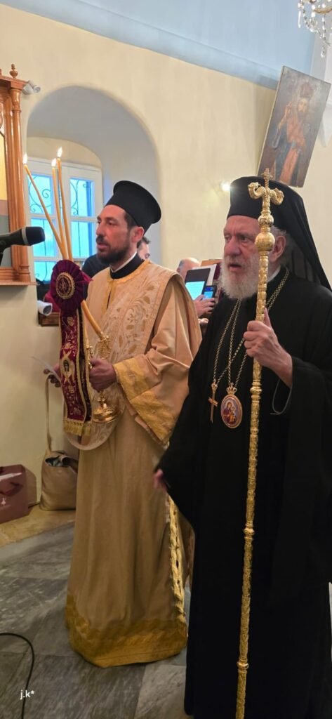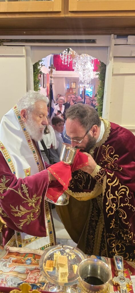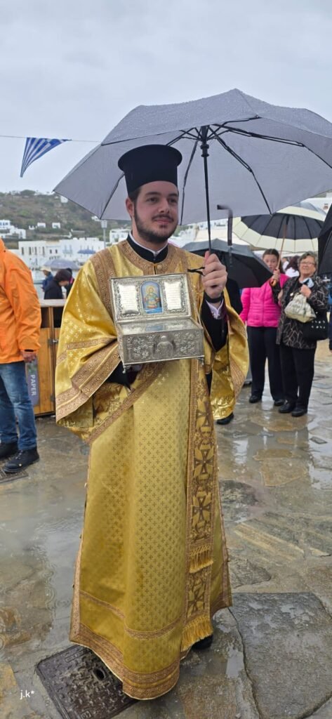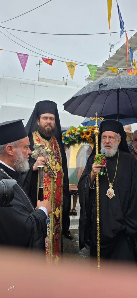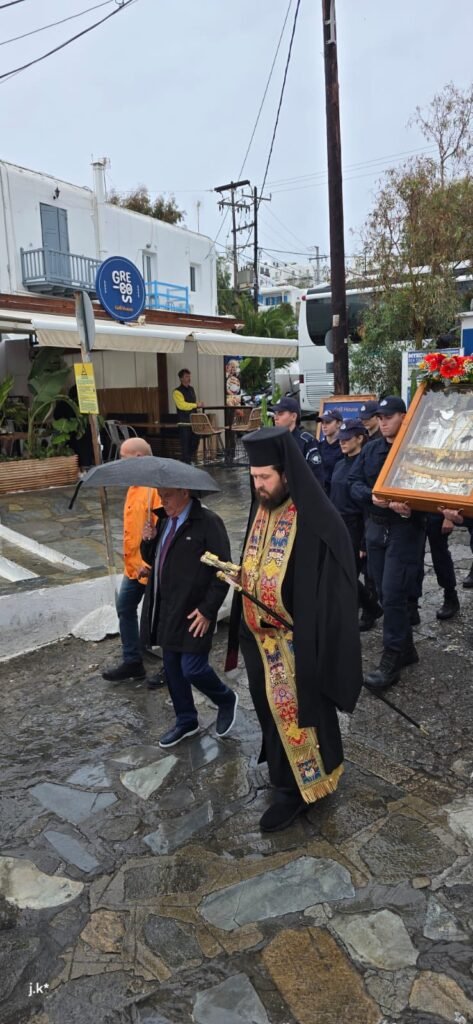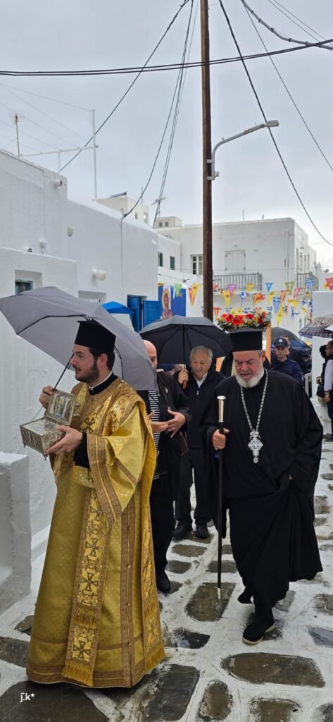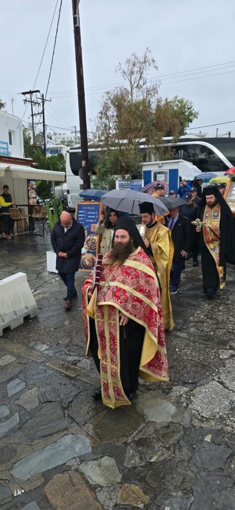 Της Θείας Λειτουργίας προέστη ο Σεβασμιώτατος Μητροπολίτης κ. Δωρόθεος Β’, περιστοιχισμένος από τον Ηγούμενο της Ιεράς Μονής Παναγίας Τουρλιανής, Αρχιμ. Αλέξιο Παπαδόπουλο, τον Εφημέριο του Ναού και Αρχιερατικό Επίτροπο Μυκόνου και Δήλου, Πρωτοπρ. Πέτρο Μαραγκό, τον Συνεφημέριό του Πρωτοπρ. Γεώργιο Κουσαθανά, τον Αρχιμ. Αθανάσιο από την Ιερά Μητρόπολη Ιερισσού και τον Διάκονό του.