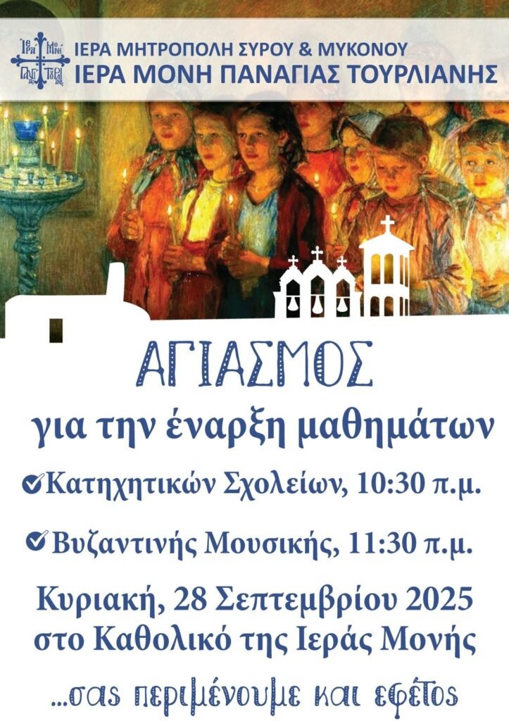 Με μια ιδιαίτερη τελετή Αγιασμού, που θα πραγματοποιηθεί την Κυριακή, 28 Σεπτεμβρίου 2025, η Ιερά Μητρόπολη Σύρου και Μυκόνου και η Ιερά Μονή Παναγίας Τουρλιανής δίνουν το έναυσμα για την έναρξη της νέας σχολικής χρονιάς στα Κατηχητικά Σχολεία.