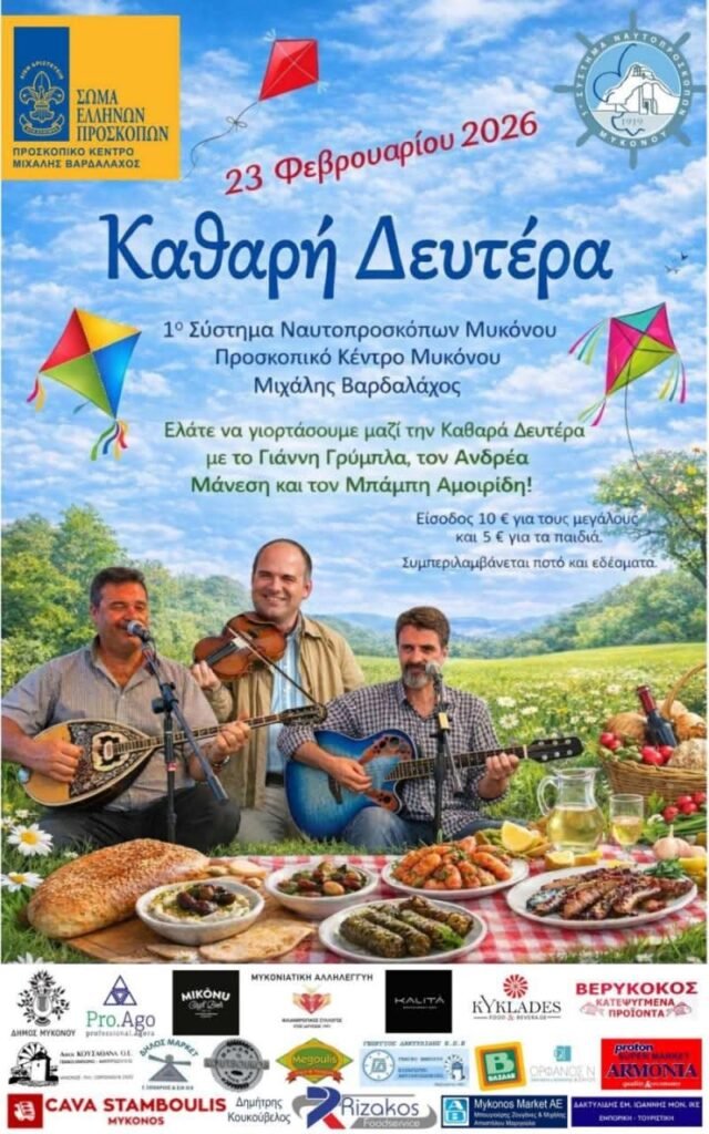 Με μεγάλη συμμετοχή πραγματοποιήθηκε την Καθαρά Δευτέρα, 23 Φεβρουαρίου 2026, στο Προσκοπικό Κέντρο Μυκόνου “Μιχάλης Βαρδαλάχος”, η καθιερωμένη επί 34 έτη διοργάνωση των Κούλουμων από τους Πρόσκοπους Μυκόνου. Μια διοργάνωση σε συνεργασία με τον Δήμο Μυκόνου, για την Μυκονιάτικη κοινωνία. Οι πρόσκοποι, οι γονείς και οι φίλοι γιόρτασαν παραδοσιακά τα Κούλουμα με ζωντανή μουσική, χορό, νηστίσιμους μεζέδες και διαγωνισμό χαρταετού.