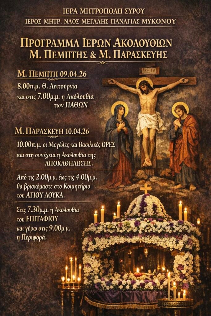 Σε κλίμα βαθιάς κατάνυξης και θρησκευτικής ευλάβειας αναμένεται να κορυφωθεί το Θείο Δράμα στον Ιερό Μητροπολιτικό Ναό Μεγάλης Παναγίας Μυκόνου, σύμφωνα με το επίσημο πρόγραμμα που ανακοινώθηκε από την Ιερά Μητρόπολη Σύρου.