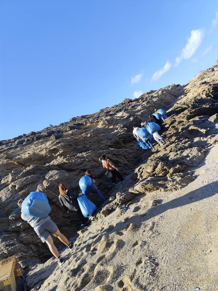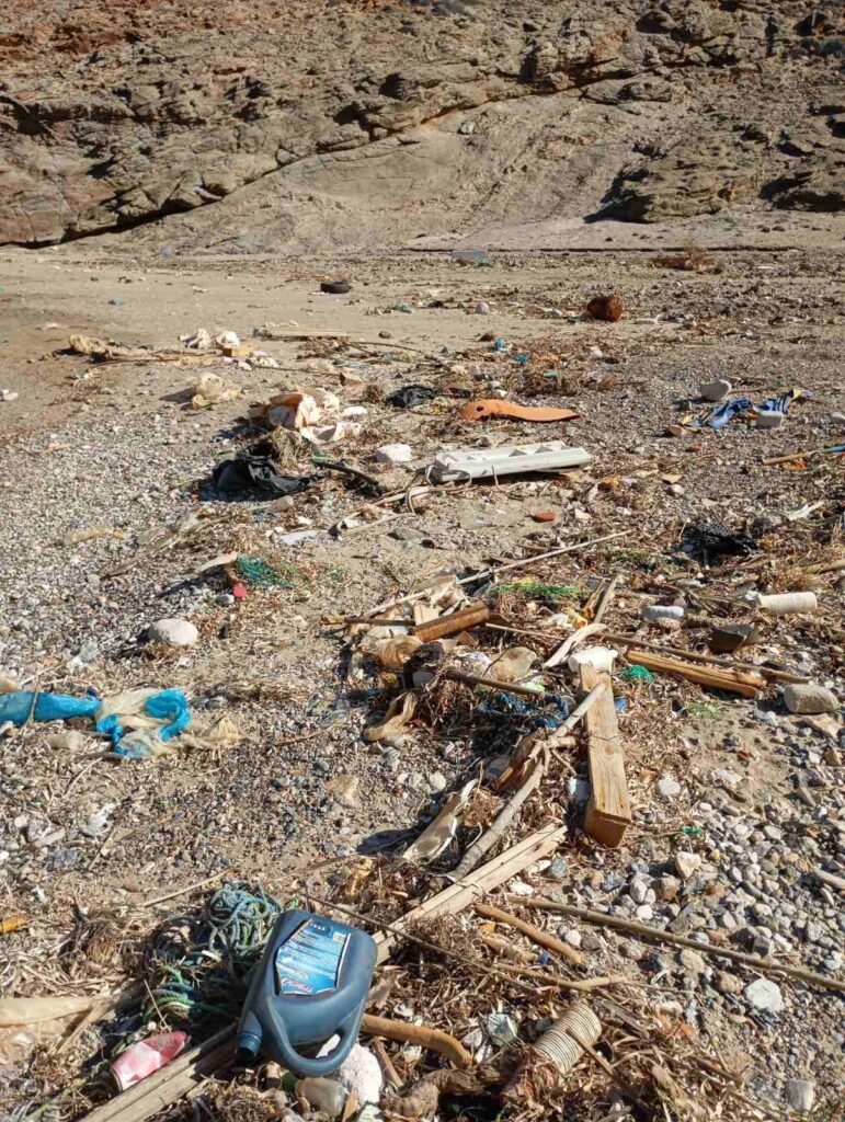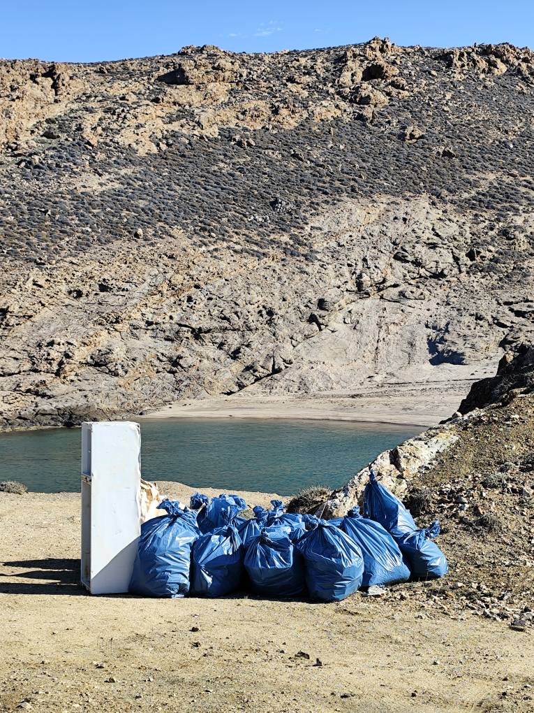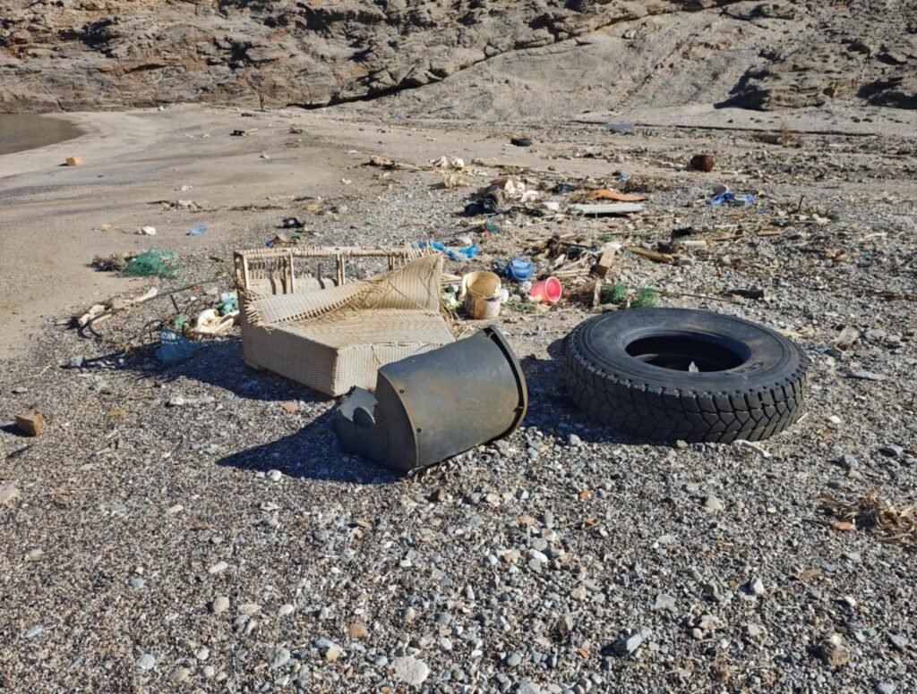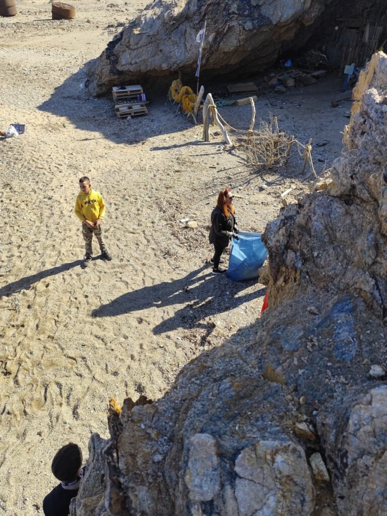 Ενώ όλες οι σακούλες ανέβηκαν στο πάνω μέρος της παραλίας για να τις παραλάβει το φορτηγό του Δήμου, τα μεγάλα και δυσκίνητα κομμάτια είναι αδύνατον να μετακινηθούν με τα χέρια μέσα στα βράχια.