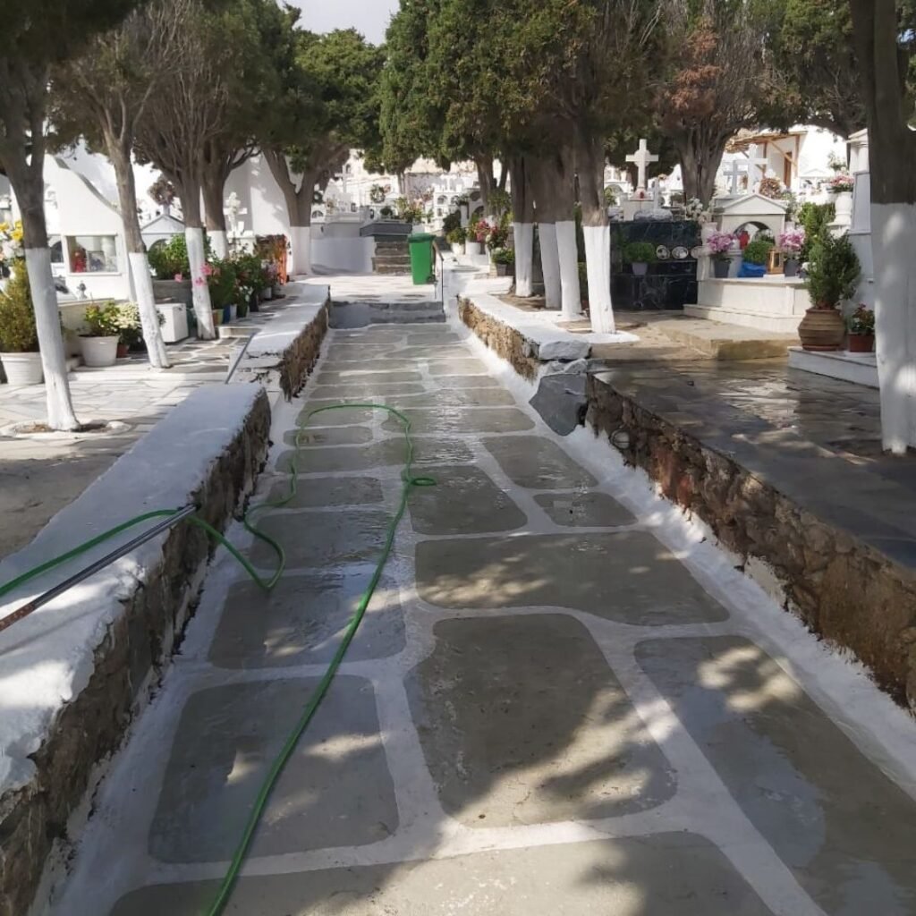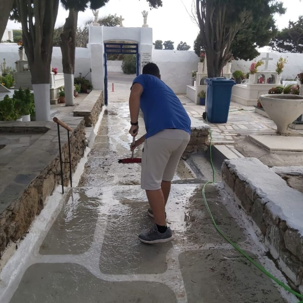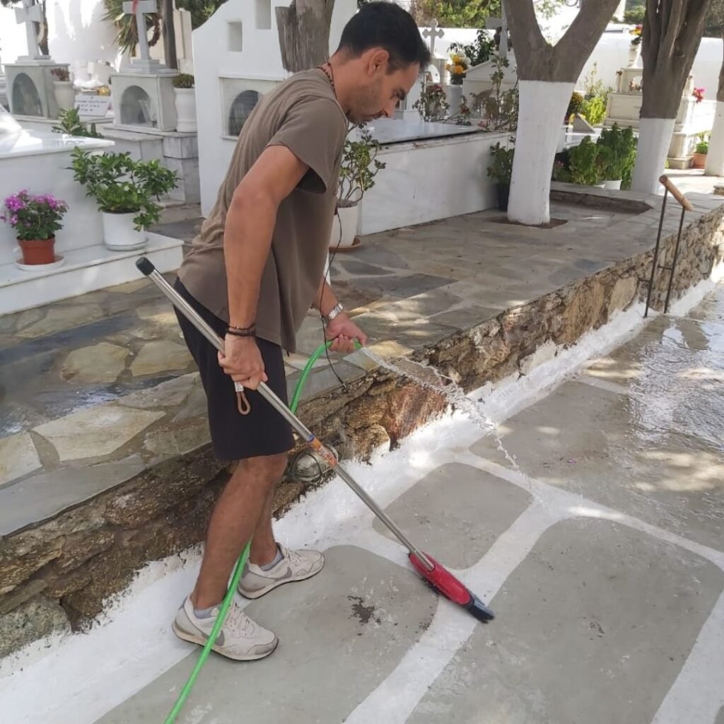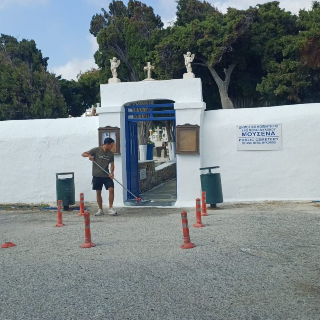 Στο πλαίσιο των εργασιών για τον ευπρεπισμό του χώρου, ο κ. Ελευθερίου συμμετείχε προσωπικά στον καθαρισμό και τον καλλωπισμό, δείχνοντας έμπρακτα τον σεβασμό και τη φροντίδα που πρέπει να αποδίδεται σε έναν τόπο όπου αναπαύονται οι ψυχές των δικών μας ανθρώπων.