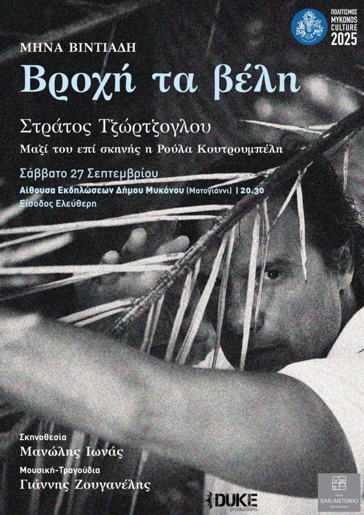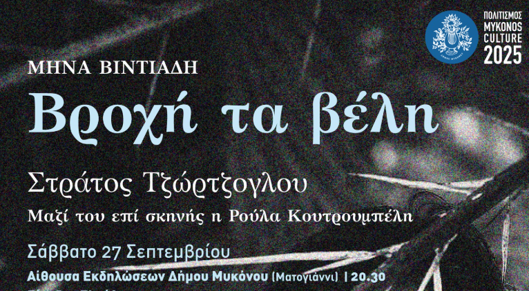 Το νέο έργο του θεατρικού συγγραφέα Μηνά Βιντιάδη με τίτλο “Βροχή τα βέλη”, σε σκηνοθεσία του Μανώλη Ιωνά, με πρωταγωνιστή τον Στράτο Τζώρτζογλου, με μουσική και τραγούδια του Γιάννη Ζουγανέλη, ξεκινάει την περιοδεία του σε πόλεις της Ελλάδας από τη Μύκονο, πριν από την πρεμιέρα του στην Αθήνα, στις 4 Νοεμβρίου.