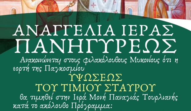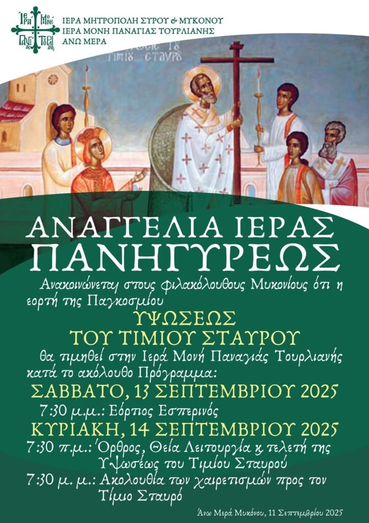 Η Ιερά Μονή Παναγίας Τουρλιανής στην Άνω Μερά Μυκόνου ετοιμάζεται να τιμήσει με λαμπρότητα τη μεγάλη εορτή της Παγκόσμιου Υψώσεως του Τιμίου Σταυρού. Σύμφωνα με την ανακοίνωση της Ιεράς Μητρόπολης Σύρου & Μυκόνου, οι εορταστικές εκδηλώσεις θα ξεκινήσουν το Σάββατο, 13 Σεπτεμβρίου 2025.