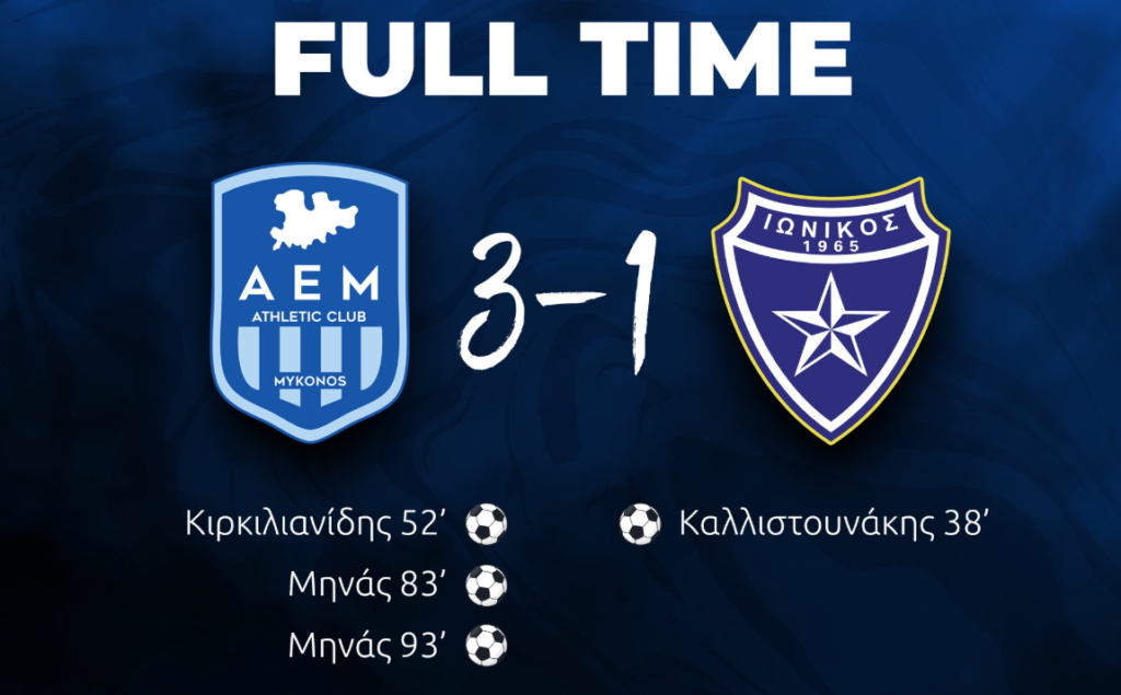 Με το δεξί ξεκίνησε τις υποχρεώσεις της στο πρωτάθλημα της Γ’ Εθνικής ο ΑΕΜ Μυκόνου, επικρατώντας με σκορ 3-1 του Ιωνικού, σε έναν αγώνα όπου έδειξε ψυχή και κατάφερε να γυρίσει το παιχνίδι από το 0-1.