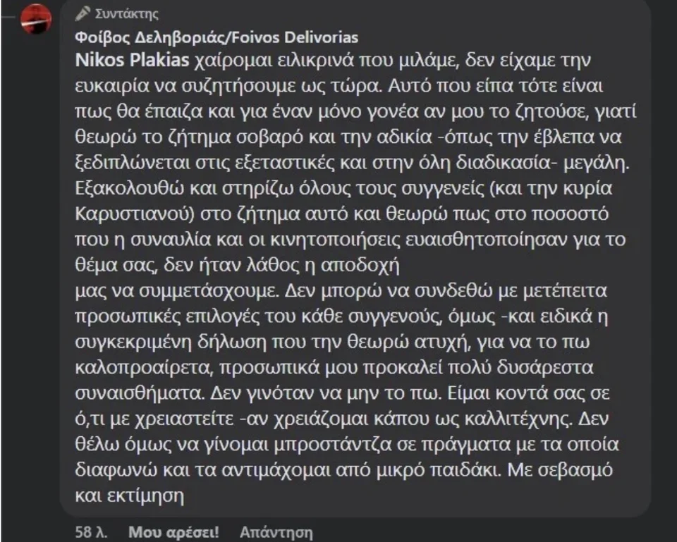 Εν τω μεταξύ, ένας από όσους αντέδρασαν στα λεγόμενα Καρυστιανού για τις αμβλώσεις ήταν και ο Φοίβος Δεληβοριάς, με την τοποθέτησή του ωστόσο να προκαλεί την αντίδραση Πλακιά, ο οποίος του έριξε ευθύνες για το πού οδηγήθηκαν τα πράγματα με τον Σύλλογο όταν πριν από ενάμιση χρόνο δεν άκουσε μερίδα γονιών των Τεμπών που διαφωνούσαν με τη συναυλία με εισιτήριο στο όνομα των παιδιών τους.