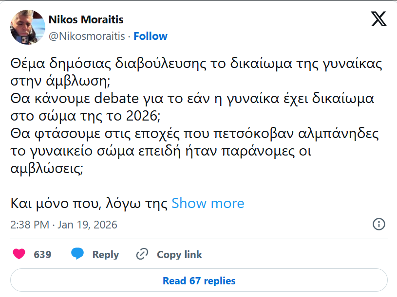 «Θέμα δημόσιας διαβούλευσης το δικαίωμα της γυναίκας στην άμβλωση; Θα κάνουμε debate για το εάν η γυναίκα έχει δικαίωμα στο σώμα της το 2026; Θα φτάσουμε στις εποχές που πετσόκοβαν αλμπάνηδες το γυναικείο σώμα επειδή ήταν παράνομες οι αμβλώσεις; Και μόνο που, λόγω της δημοτικότητας της κυρίας Καρυστιανού, ανοίγει τέτοια συζήτηση σήμερα στη χώρα, είναι ανατριχιαστικό. Απεριόριστος σεβασμός στη μητέρα Καρυστιανού που ζητάει δικαιοσύνη για το παιδί της. Με την πολιτικό Καρυστιανού κάθετη διαχωριστική γραμμή από εμένα, με όποιο προσωπικό κόστος. Ως εδώ. Δε θα γυρίσουμε 100 χρόνια πίσω. ΩΣ ΕΔΩ ΟΜΩΣ», έγραψε οργισμένος ο Νίκος Μωραΐτης.