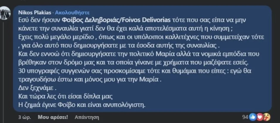 Τριάντα υπογραφές συγγενών σας προσκομίσαμε τότε και θυμάμαι που είπες: ”εγώ θα τραγουδήσω έστω και μόνος μου για τη Μαρία”. Δεν ξεχνάμε. Και τώρα λες ότι είσαι δίπλα μας. Η ζημιά έγινε Φοίβο και είναι ανυπολόγιστη» ανέφερε στην ανάρτησή του ο Νίκος Πλακιάς.