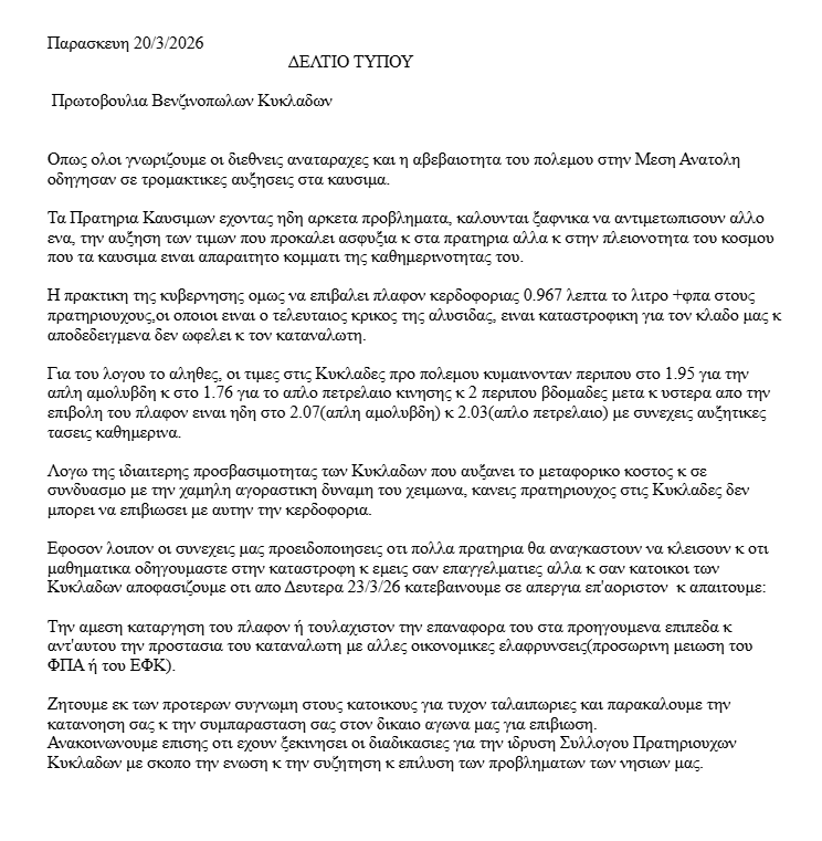 Αναλυτικά, η ανακοίνωση από την Πρωτοβουλία Βενζινοπωλών Κυκλάδων: