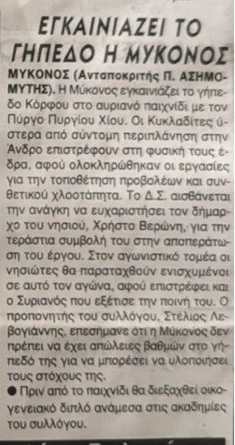 Το Mykonos 24/7 ανέτρεξε στο αρχείο της εφημερίδας «ΦΩΣ» του 2003, ξυπνώντας μνήμες από την προηγούμενη μεγάλη αναβάθμιση του γηπέδου. Τότε, με προπονητή τον Στέλιο Λεβογιάννη και ανταποκριτή τον Π. Ασημομύτη, ο Κόρφος εγκαινίαζε τον νέο του χλοοτάπητα και τους προβολείς σε έναν αγώνα απέναντι στη Χίο.