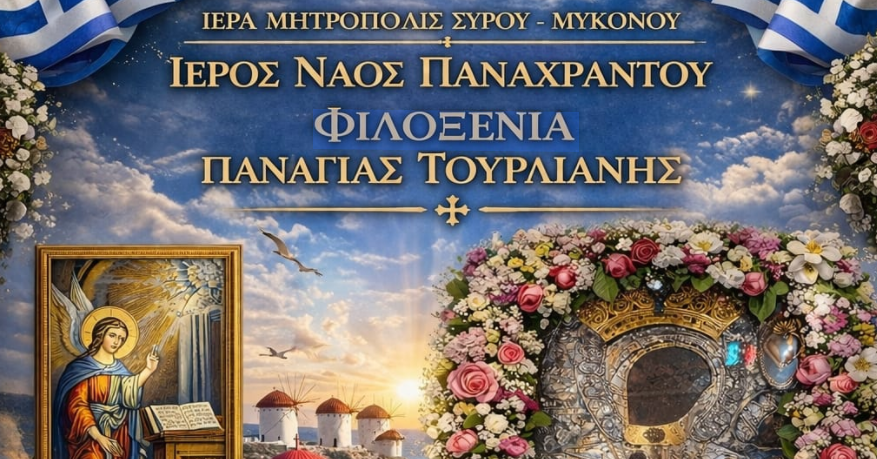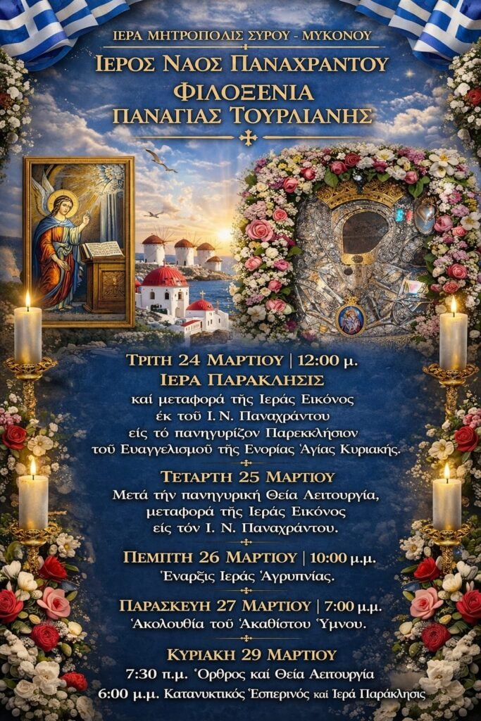 Με ιδιαίτερη εκκλησιαστική λαμπρότητα και κατάνυξη αναμένεται να πραγματοποιηθεί η φιλοξενία της Ιεράς Εικόνας της Παναγίας Τουρλιανής στον Ιερό Ναό Πανάχραντου, στο πλαίσιο των εορταστικών εκδηλώσεων της Ιεράς Μητροπόλεως Σύρου – Μυκόνου για την 25η Μαρτίου.
