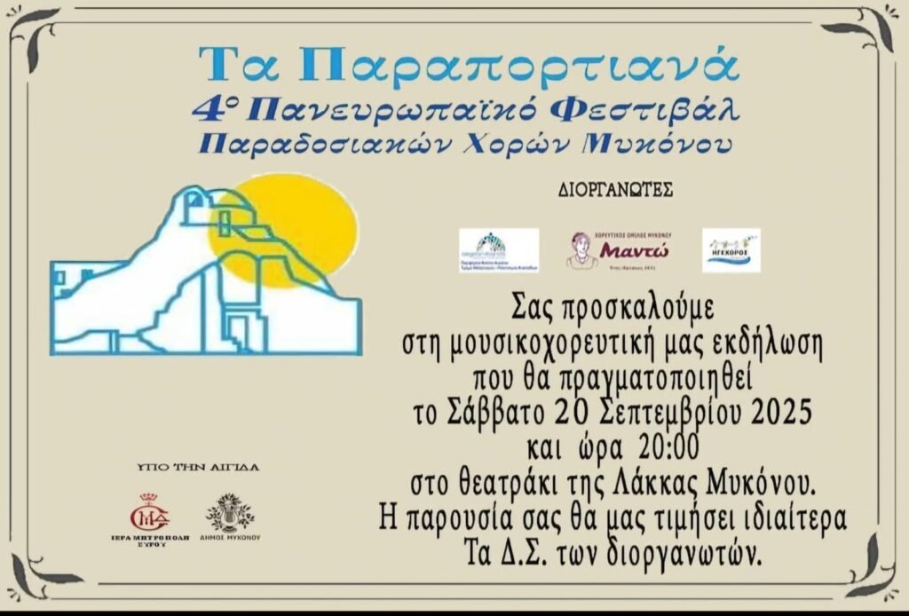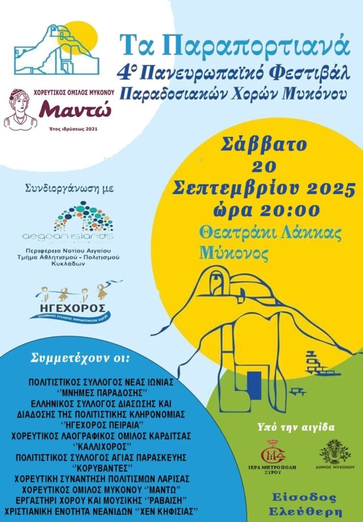 Ένα ξεχωριστό πολιτιστικό γεγονός πρόκειται να φιλοξενήσει η Μύκονος, καθώς το Σάββατο 20 Σεπτεμβρίου 2025, στις 20:00, θα πραγματοποιηθεί στο Θεατράκι της Λάκκας το «4ο Πανευρωπαϊκό Φεστιβάλ Παραδοσιακών Χορών Μυκόνου», με τίτλο «Τα Παραπορτιανά».