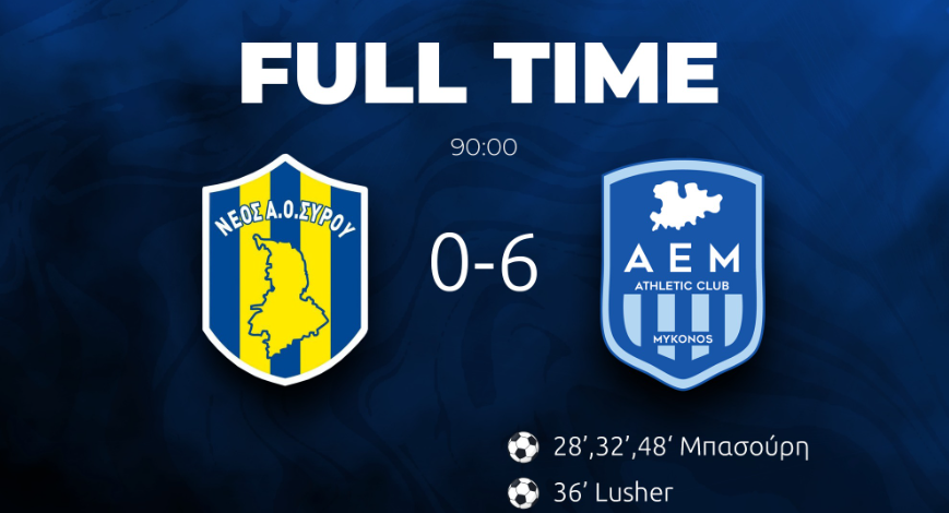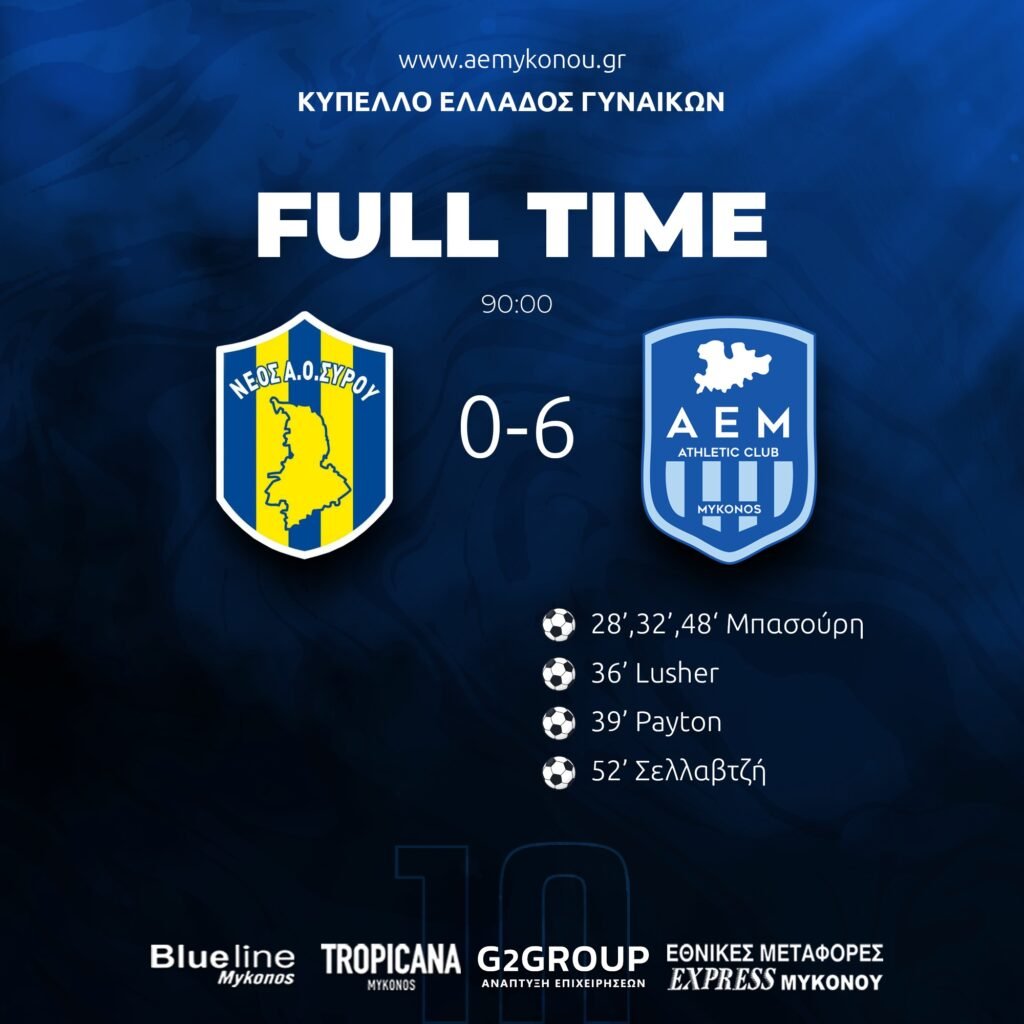 Με εμφατική νίκη ξεκίνησε τις υποχρεώσεις της στο Κύπελλο Ελλάδος Γυναικών το γυναικείο τμήμα της ΑΕ Μυκόνου, συντρίβοντας τον Νέο Α.Ο. Σύρου με το εντυπωσιακό 0-6, σε έναν αγώνα που διεξήχθη στο γήπεδο της Ερμούπολης. Η ομάδα της Μυκόνου ήταν καταιγιστική, κυριάρχησε απόλυτα στον αγωνιστικό χώρο και πανηγύρισε μία μεγάλη πρόκριση.