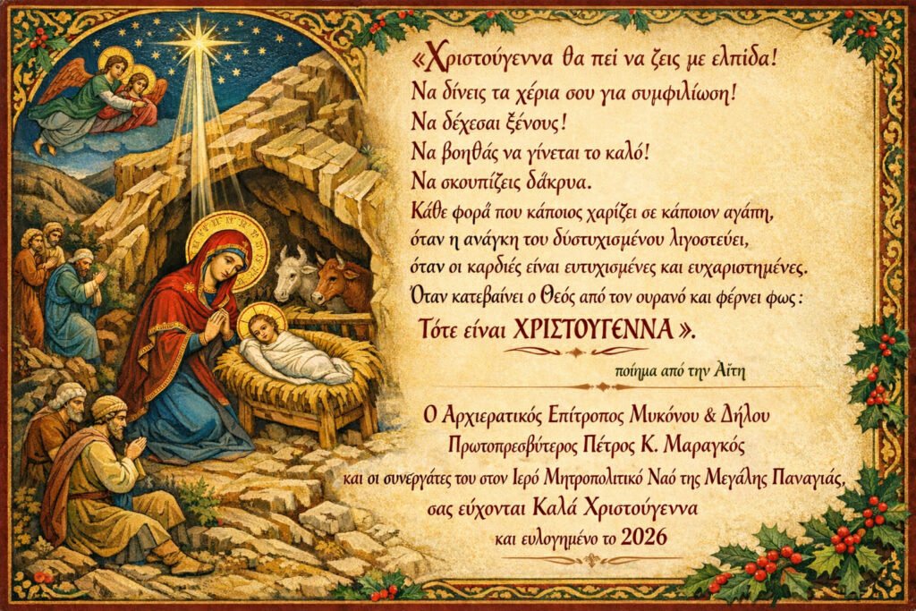 Με ένα βαθύτατα ανθρώπινο και πνευματικό μήνυμα, ο Αρχιερατικός Επίτροπος Μυκόνου & Δήλου, Πρωτοπρεσβύτερος Πέτρος Κ. Μαραγκός, απευθύνει τις φετινές του ευχές προς τους πιστούς και τους κατοίκους των νησιών μας για τη μεγάλη εορτή των Χριστουγέννων και την έλευση του νέου έτους.