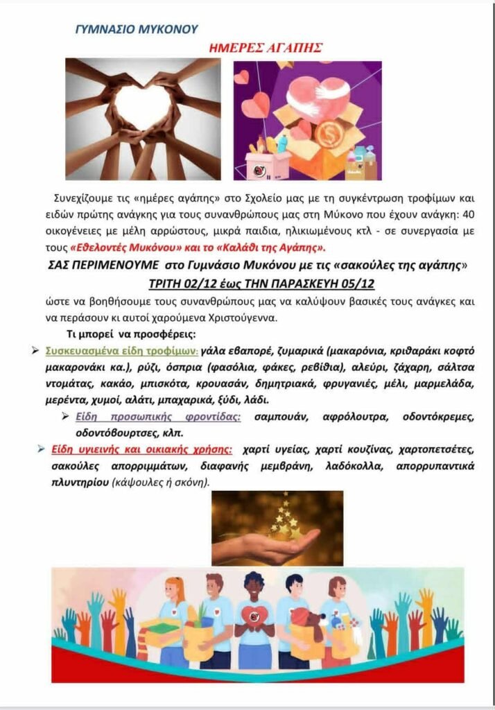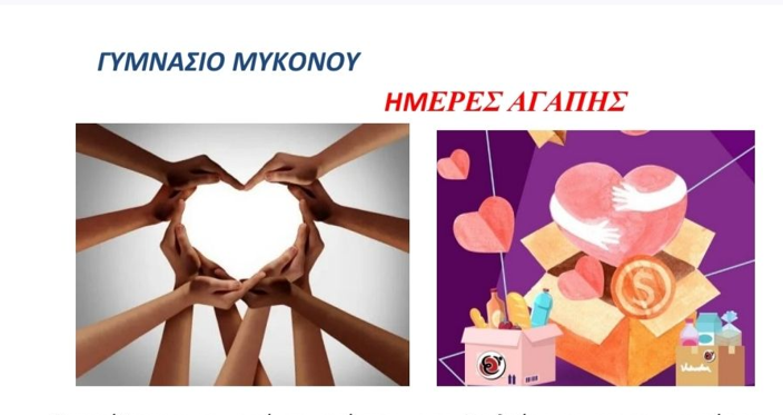 Σε μια σημαντική πρωτοβουλία κοινωνικής αλληλεγγύης προχωρά το Γυμνάσιο Μυκόνου, διοργανώνοντας τις «Ημέρες Αγάπης» με στόχο τη συλλογή τροφίμων και ειδών πρώτης ανάγκης για τους συμπολίτες μας που διαβιούν σε δύσκολες συνθήκες.