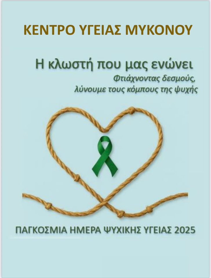 Με μία συμβολική και ουσιαστική δράση, το Κέντρο Υγείας Μυκόνου τίμησε την Παγκόσμια Ημέρα Ψυχικής Υγείας. Την ημέρα αυτή, το σύνολο του προσωπικού υιοθέτησε ένα ισχυρό μήνυμα ελπίδας και αποδοχής, φορώντας την πράσινη κορδέλα, το διεθνές σύμβολο της ψυχικής υγείας.