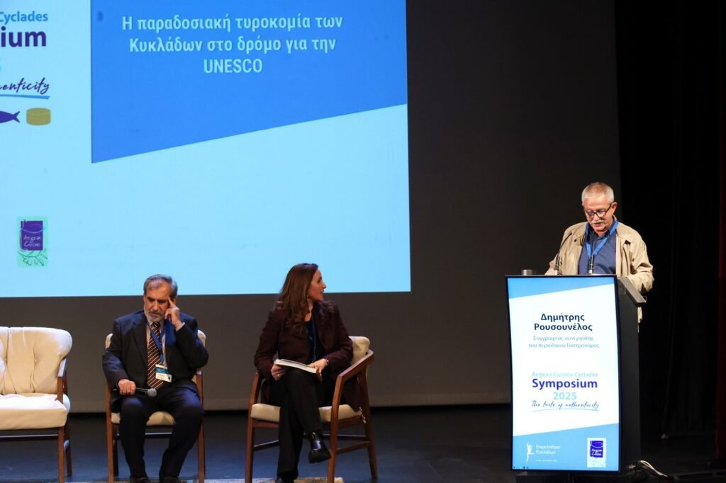 Ο ομιλητής κ. Δημήτρης Ρουσουνέλος, Γευσιθήρας και συγγραφέας, στο πλαίσιο του Συμποσίου, τόνισε τη μεγάλη ευκαιρία που ανοίγεται μέσω της UNESCO, αλλά εξέπεμψε και ένα «καμπανάκι ύστατης ώρας» για τον πρωτογενή και δευτερογενή τομέα. Ο λόγος του, όπως τόνισε, αφορά τη διαφύλαξη της «ψυχής των νησιών μας» και την αυθεντικότητα που κινδυνεύει να αλλοτριωθεί από την εμπορευματοποίηση.