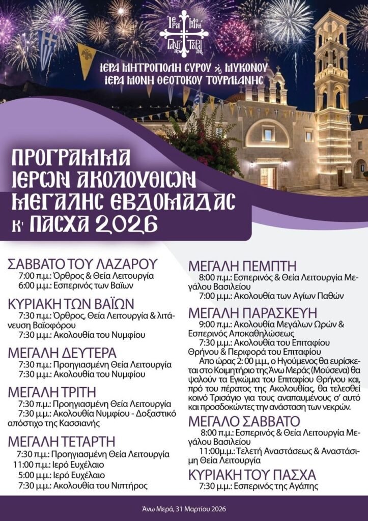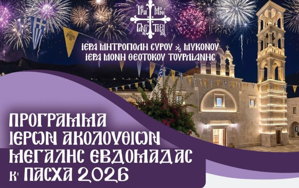 Με κάθε επισημότητα και κατάνυξη ανακοινώθηκε το πρόγραμμα των Ιερών Ακολουθιών για τη Μεγάλη Εβδομάδα και το Άγιο Πάσχα 2026 από την Ιερά Μονή Θεοτόκου Τουρλιανής, υπό την αιγίδα της Ιεράς Μητροπόλεως Σύρου και Μυκόνου.