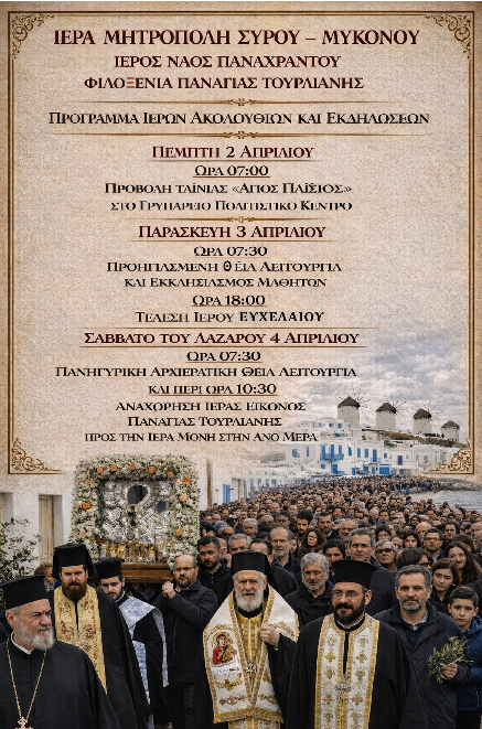 Με ιδιαίτερη λαμπρότητα και κατάνυξη αναμένεται να κορυφωθούν οι εκδηλώσεις για τη φιλοξενία της Ιεράς Εικόνας της Παναγίας Τουρλιανής στον Ιερό Ναό Παναχράντου, σύμφωνα με το επίσημο πρόγραμμα της Ιεράς Μητροπόλεως Σύρου – Μυκόνου.