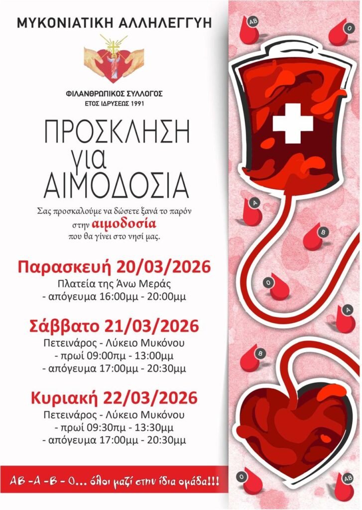 Η «Μυκονιάτικη Αλληλεγγύη», με έτος ιδρύσεως το 1991, συνεχίζει το κοινωνικό της έργο, υπενθυμίζοντας ότι οι ανάγκες για αίμα δεν σταματούν ποτέ και η συμμετοχή όλων —ανεξαρτήτως ομάδας αίματος— είναι καθοριστική.